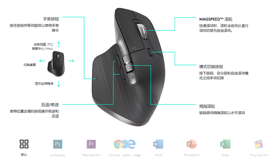 在使用体验上,MX Master 3 延续了其系列的自定义程序按键功能,可针对大多数应用程序自定义设置,通过位置合理的前进/后退按键、手势按键和全新拇指滚轮轻松地进行创造、制作以及更多操控,提高应用程序中的生产效率。