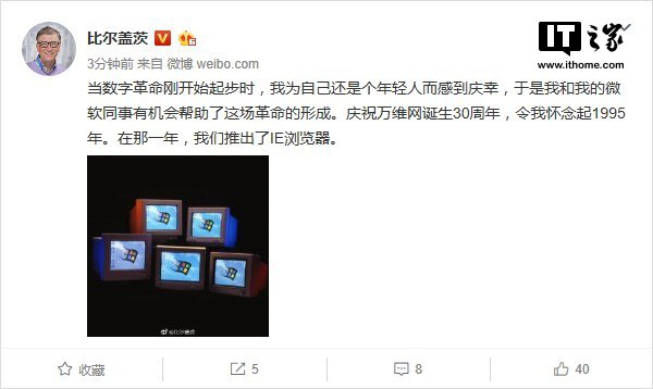 今天,比尔盖茨发表微博称,庆幸自己参与了数字革命的形成,在万维网诞生 30 周年时,很怀念 1995 年,在那一年,微软推出了 IE 浏览器。