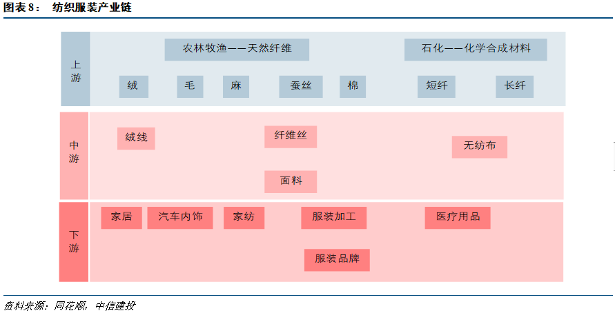 中国是世界上最大的纺织品服装生产和出口国,拥有丰富、系统、完整的纺织产业链,包括上游的原料供给,如石化、农业,中游的加工及制造环节,下游的服装业、家用纺织品、产业用纺织品等,贯穿于整个产业链。
