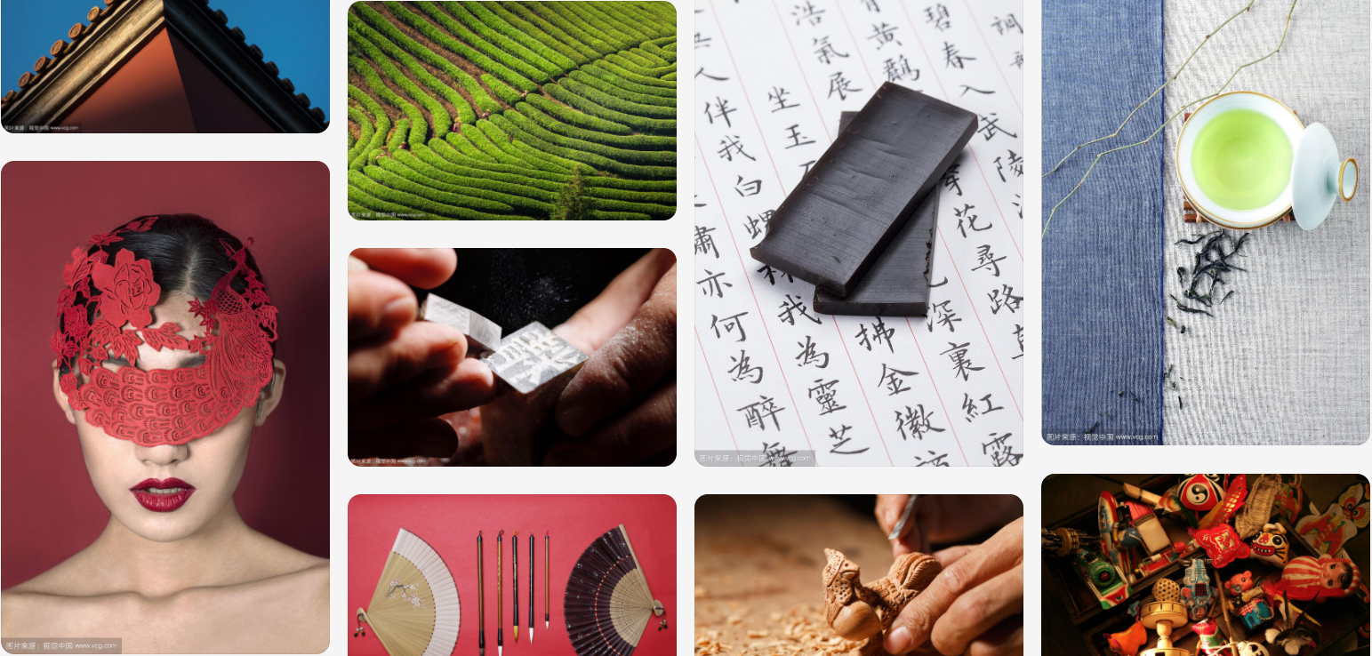 说起中国元素首先会想到中国书法、篆刻印章、中国结、京戏脸谱、皮影、剪纸、龙凤纹样、祥云图案、中国刺绣、蜡染、中国瓷器;国画、敦煌壁画、太极图;唐装、绣花鞋、老虎头鞋、旗袍、肚兜、斗笠、帝王的皇冠、皇后的凤冠;千层底、丝绸等。这些中国符号对时装行业的影响很大,传统的东方元素已经是很多国家服装设计师的设计灵感源泉。中国传统服装的深厚文化底蕴是设计师们取之不尽的创意源泉。随着中国传统元素开始走向世界舞台,传统元素重新引起了设计界的关注。
