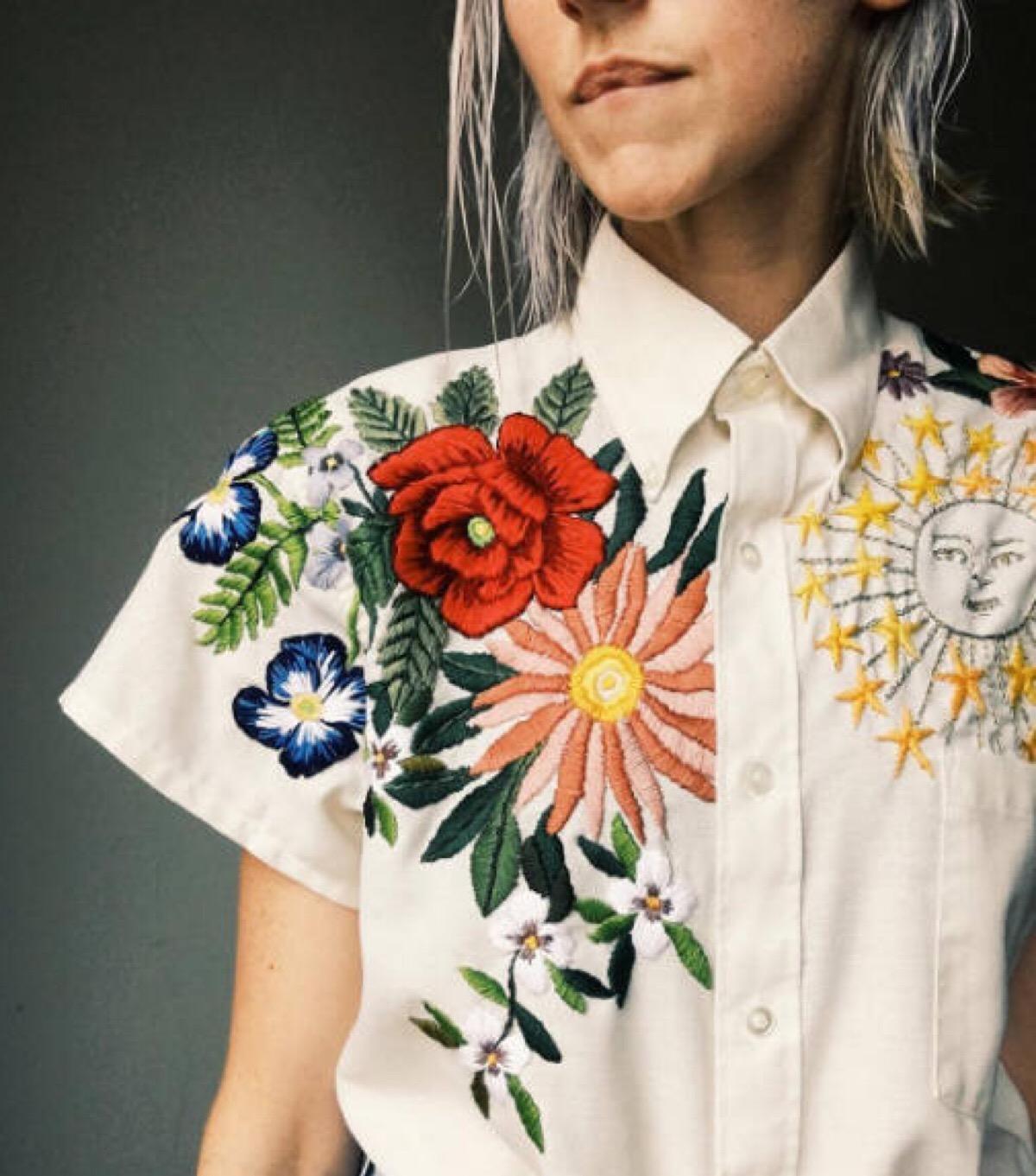 刺绣是在已经加工好的织物上,以针引线,按照要求进行穿刺,通过运针将绣线和其他物品组织成各种图案和色彩的一种技艺。由于现代艺术设计思想的影响,传统的刺绣艺术正渗透到现代服装设计中,刺绣工艺形式的多样化应用及创新设计,能够充分体现服装的设计风格,丰富服装的造型效果,满足人们对服装审美的多元化需求。中国传统的旗袍最常用彩绣工艺,用各色的彩色丝线通过重叠、并置、交错产生丰富的色彩变化,使得服装上的花朵栩栩如生,犹如水墨画一样。在现代服装设计中,运用刺绣工艺最集中的地方是袖口、衣领、胸襟、裤脚等。在简单的T恤上刺绣流行的图案纹样,图案的立体感和流行性使T恤具有很强的现代感。现在国内有些品牌的牛仔服饰刺绣上不同的图案后,使牛仔服装别有一番韵味,也使牛仔这种比较随意的服装多了一些女性韵味。