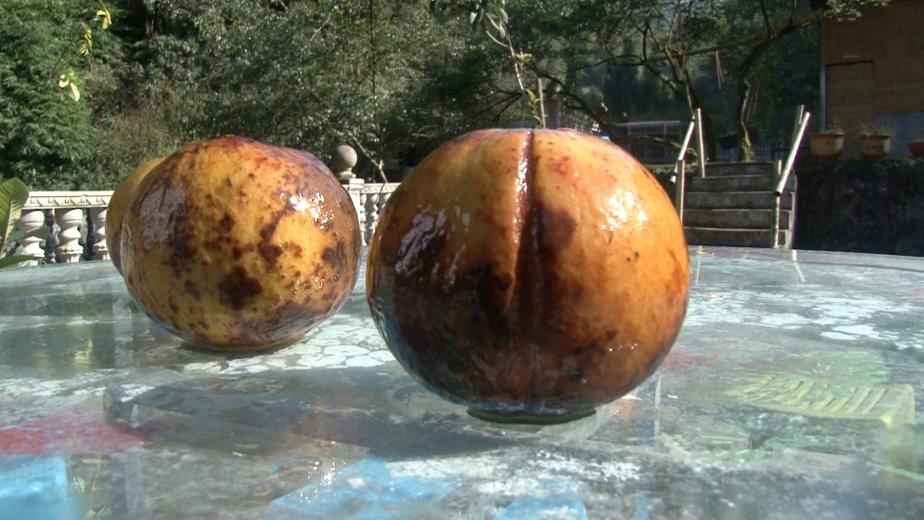 “这就是我们高峰村的红花大油茶,1000多亩,今年收了20吨左右,它是油中之王,20多斤毛果子能榨出一斤油来。”高峰村村民赵远香拿着一个红花大油茶果实说道。