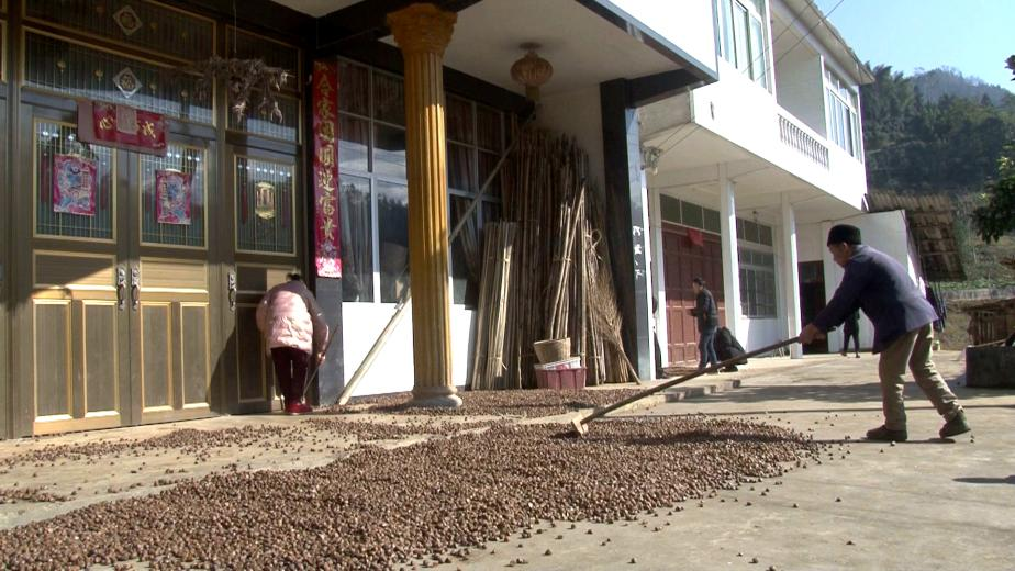 (村民在院坝里晾晒的油茶果 筠连县融媒体中心杨理提供)