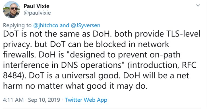 他在twitter中写道,”DoT与DoH不同,两者都提供TLS级别的隐私。但DoT可以在网络防火墙中被阻止。DoH旨在‘防止DNS操作中的路径干扰’,DoT存在普适性的好处。而无论DoH有什么可取之处,它都将会带来一种净伤害。“