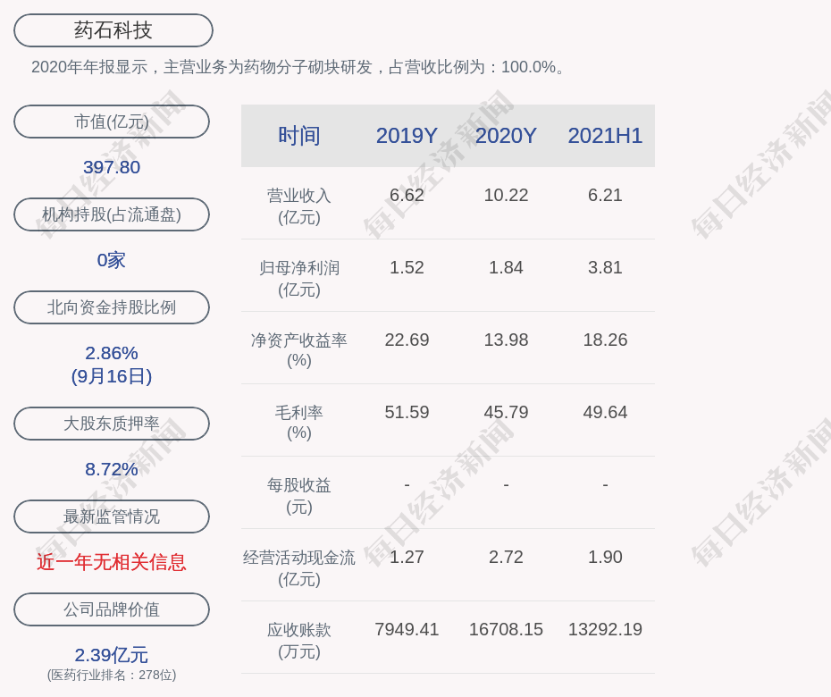 2020年年报显示,药石科技的主营业务为药物分子砌块研发,占营收比例为:100.0%。