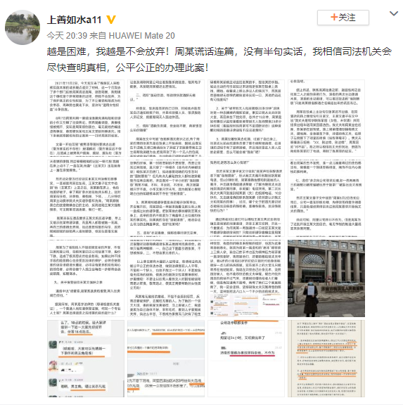周某毫无底线的撒谎,不但不会受到惩罚,反而还要被保护,去冤枉无辜的人。为了她的一个弥天大谎,害的我家支离破碎,马上家破人亡,我婆婆因为自己身体不好,常年吃药,看到儿子蒙冤被关押,我这么辛苦,不想成为累赘而几次有了轻生的念头,我公公的抑郁症也因为此事而病情加重精神恍惚,我爸的肺癌本来控制的挺好,也因为此事而急剧恶化,就因为周某一篇虚构的“剧本”即将搭上三条人命,我自己的手术也因为精神压力和劳累一直没恢复好,我照顾他们,还要跑着给我丈夫申诉,我4岁的小宝和83岁的奶奶只能托付给身体稍微好一点儿的妈妈照顾。实在顾不上的大宝儿只能寄养在他姑姑家。我现在只恨自己分身无术,没照顾好家人,也不能尽快给我丈夫申冤。现在内忧外困压的我喘不过气来,还要到处借钱给老人们看病,但是我知道我不能垮,我垮了我们三个家庭就毁了,我一定会坚持,坚持到我丈夫沉冤得雪的那一天,坚持到把这八口人一个不少的还给我丈夫。