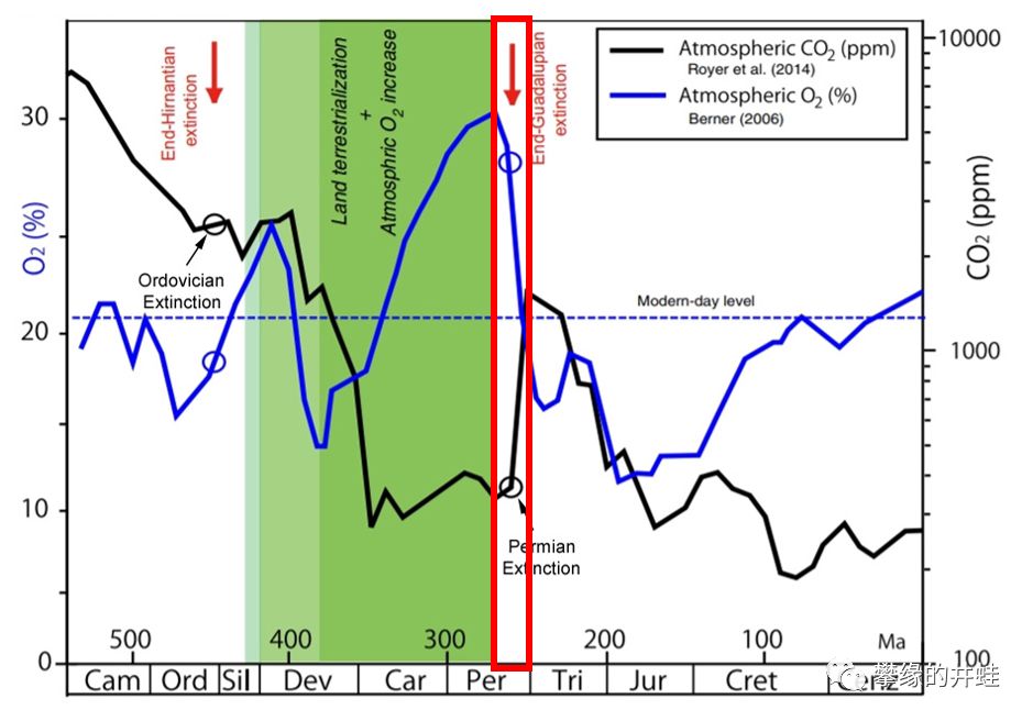 在二叠纪晚期,大气氧气含量急速下跌了一半左右;二氧化碳浓度则翻了几番。石炭-二叠纪氤氲的富氧大气不复存在,残存的动物每一次呼吸都变得无比艰难。图片来源自[13]。