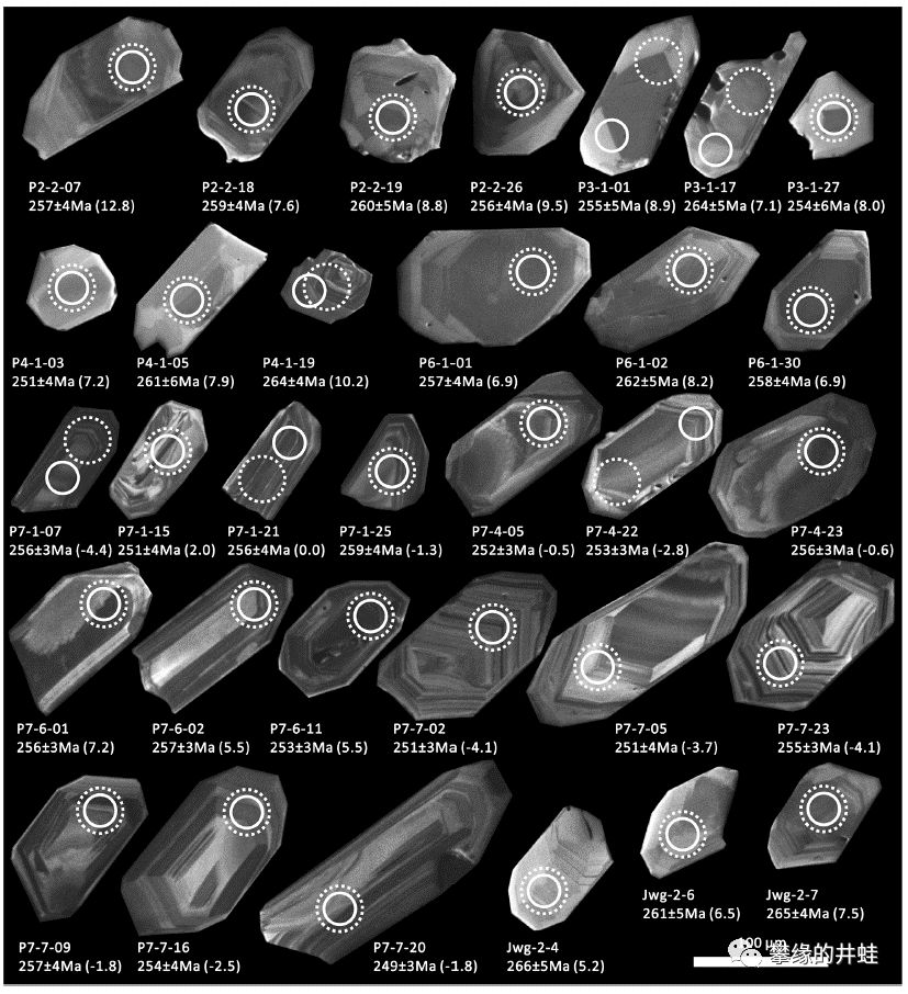 云南晚二叠世火山灰层中的锆石碎屑。样品上的圆圈是铀-铅法(实线)和镥-铪法(虚线)同位素测定的位置。测得的样品年龄也在图中标注了,基本上在峨眉山大火成岩省(260Ma)到西伯利亚暗色岩事件(250Ma)之间。图片来源自[10]。