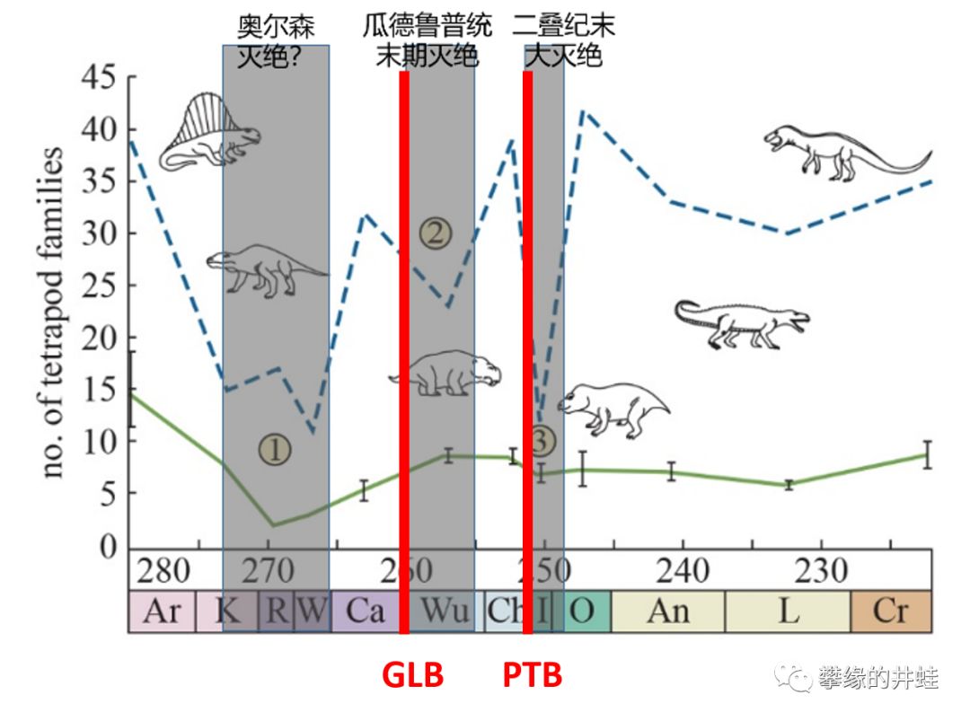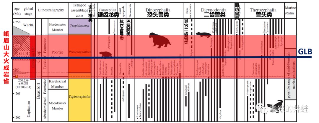 GLB,峨眉山大火成岩省事件,和兽孔目主要类群的改变。它们在时间上非常吻合。图片来源自[8]。
