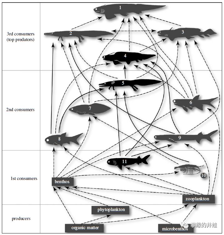 这是一张典型的二叠纪淡水食物网。酸化的雨水会无差别地攻击其中所有的生物,直到崩解整个网络,留下一个又一个空荡荡的“死湖”。图片来源自[12]。