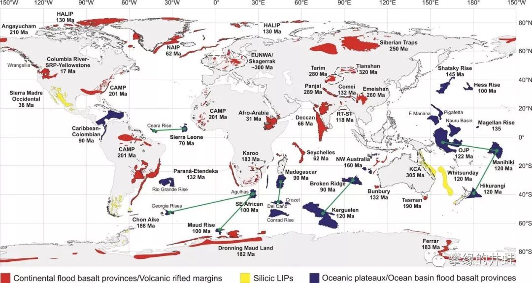 遍布全球的大火成岩省分布。它们当中最年轻的也超过3000万岁了。没有见识过地幔柱事件和大火成岩省形成,是人类的幸运。图片来源自[4]。
