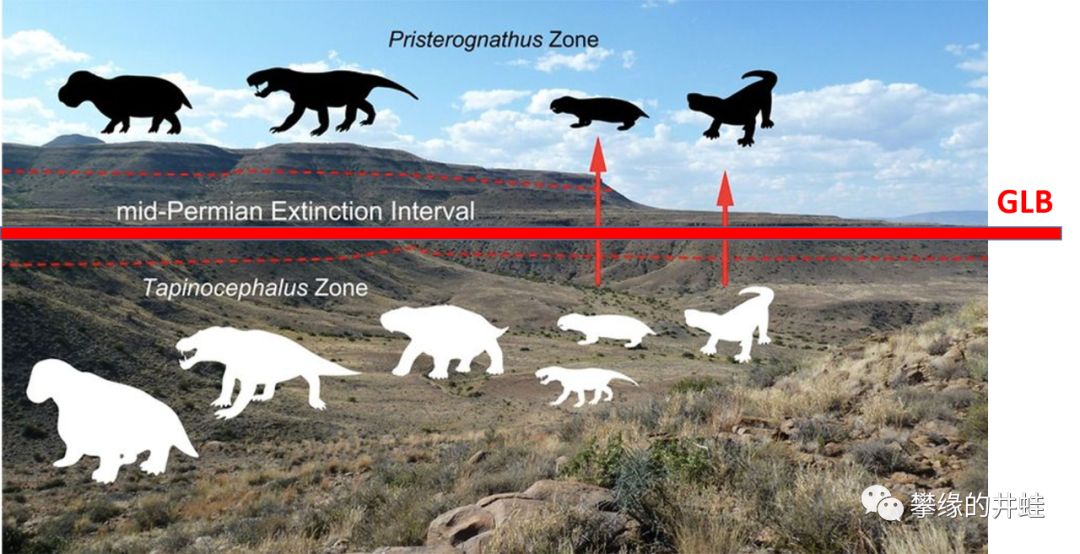 南非卡鲁盆地的GLB断面。四足动物类群在GLB两侧差异显著:恐头兽类绝迹,锯齿龙类,二齿兽类,丽齿兽类和犬齿兽类兴起。它们会享受古生代的最后1000万年,然后迎来一轮更加残酷的大灭绝。图片来源自[7]。