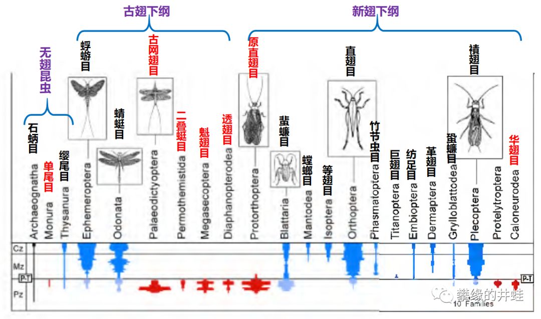 二叠纪末大灭绝颠覆了许多动物类群的地位:合弓纲与蜥形纲,软骨鱼与硬骨鱼,腕足动物与双壳类,等等。同样的一幕也发生在昆虫纲:最早的天空霸主——古翅下纲在这一役损兵折将,除蜉蝣目和蜻蜓目之外全灭,从此沦为昆虫纲的边缘角色。新翅下纲翻盘成为绝对主流。以二叠纪末大灭绝为界,昆虫纲的演化史被清晰地划分为古生代演化群(PaleozoicEvolutionary Fauna)和现代演化群(Modern Evolutionary Fauna)两个阶段。图片来源自[3]。
