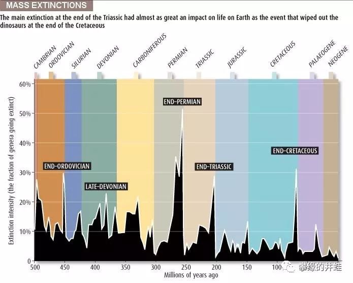显生宙历次灭绝事件烈度对比。二叠纪末超级灭绝的尖峰最为醒目,傲然俯视其他所有大中小型灭绝事件。图片来源自网络。