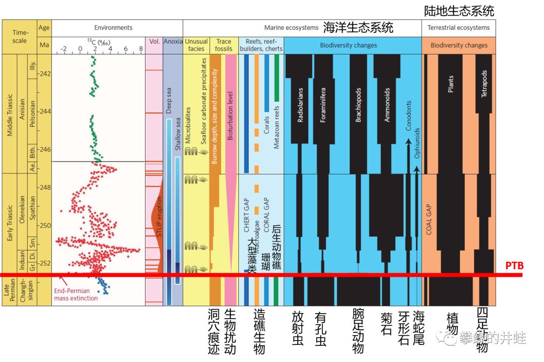 生物多样性在二叠-三叠之交的变化情况。造礁生物类群被彻底摧毁,附礁生物和底栖生物类群在PTB上方也只剩下若有若无的一丝残喘。图片来源自[1]。