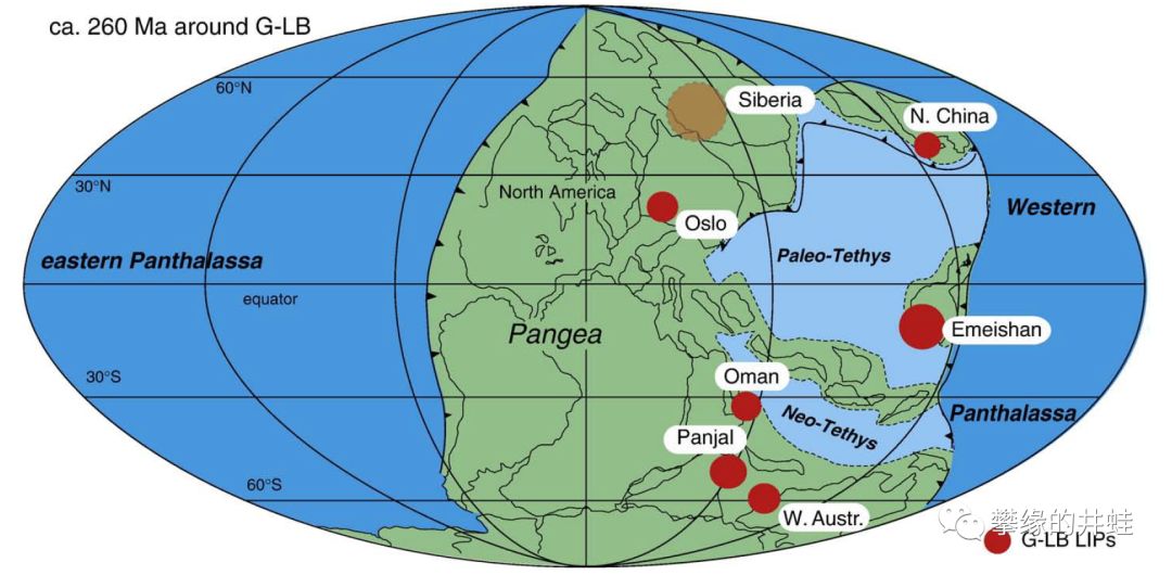 大约2.6 亿年前的中- 晚二叠世之交是地质学和古生物学上的另一个重要的节点:瓜德鲁普统- 乐平统交界线(Guadalupian-Lopingianboundary ,GLB )。地球开始进入一轮地质活动的活跃期。在这个时期,围绕古特提斯海的板块交界处发生了多次地幔柱事件,峨眉山大火成岩省是其中规模最大的一个。