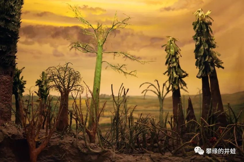 二叠纪的主要陆生植物类群:石松类,节蕨类,真蕨类,种子蕨和裸子植物,都在酸雨的灼蚀下成片地枯萎凋亡。从树皮下的微小昆虫到锯齿龙那样的巨型四足发酵罐,都断绝了食物来源,在饥饿中大批死亡。食物链就这样一级一级崩塌,最终传递到丽齿兽这样的陆地霸主,谁也逃不出这个死局。图片来源自网络。