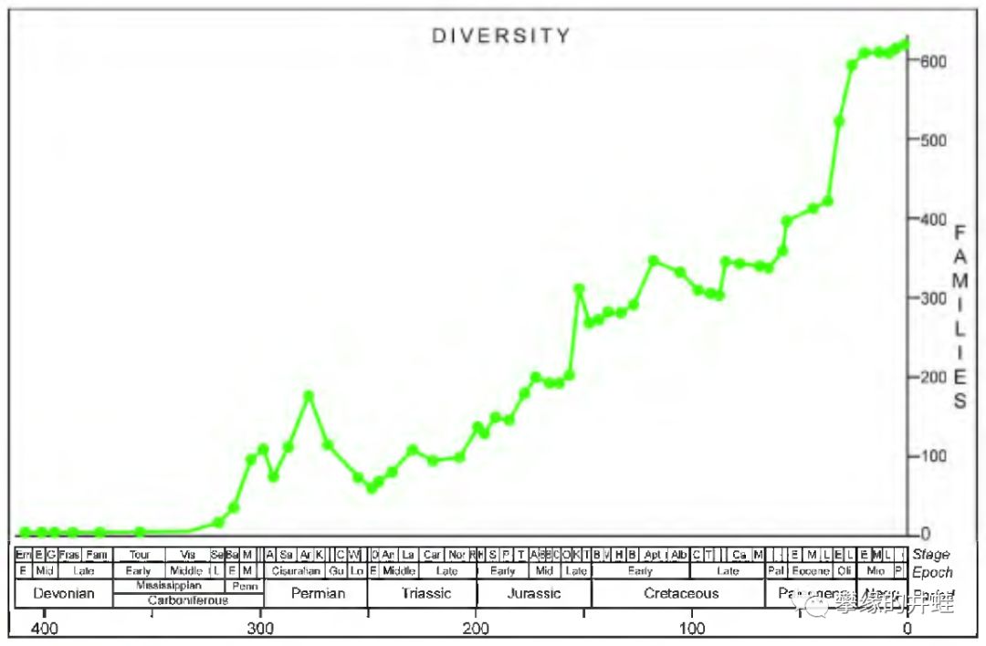 昆虫纲在地质史上的多样性(科数)变化图。在石炭纪晚期演化出飞行能力之后,昆虫基本上一路高歌猛进,唯有在二叠纪晚期损失惨重,之后5000万年发展基本停滞,直到侏罗纪才再次爬升。图片来源自[3]。