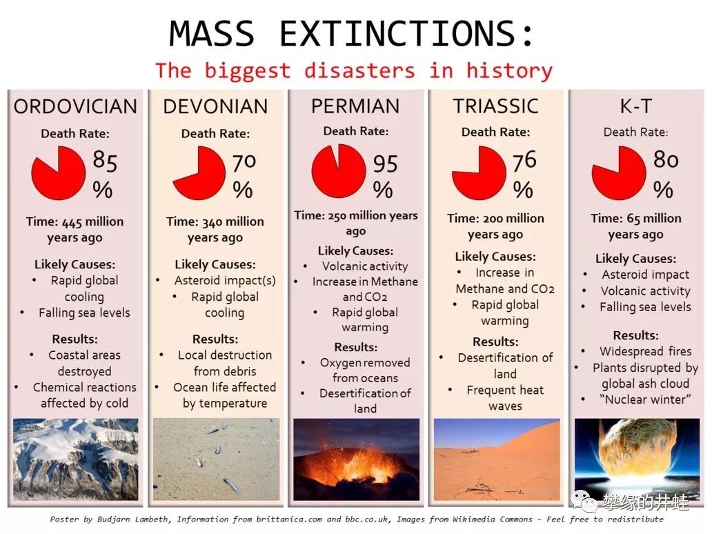 五次大灭绝事件烈度,时间,原因和影响对比图。注意灭绝率(Death Rate)的饼图,二叠纪末那一条窄窄的缺口让人看得尤其揪心。图片来源见水印。