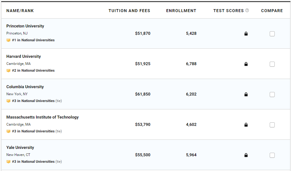 今年的榜单中,普林斯顿大学第1,哈佛大学、哥伦比亚大学、麻省理工大学紧随其后分别位列第2、第3、第4。