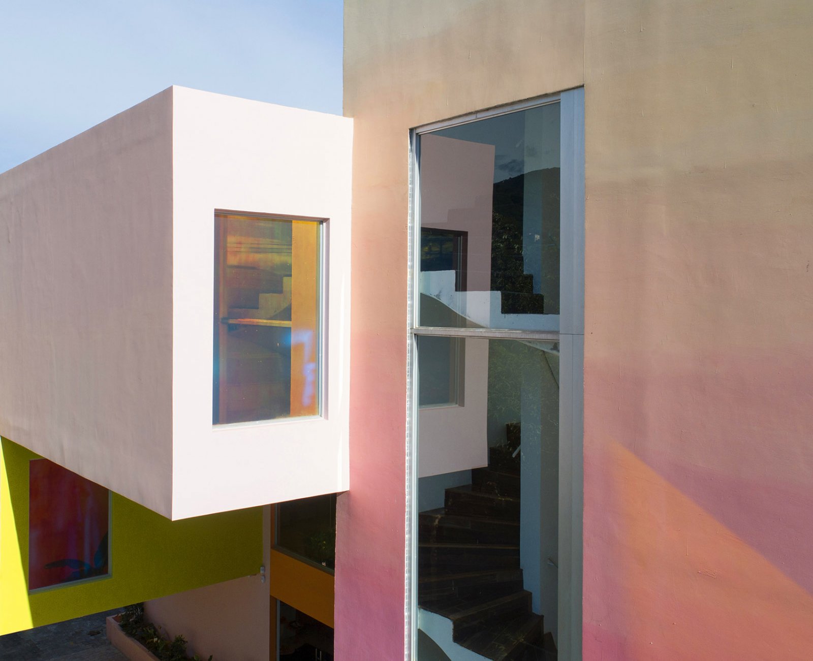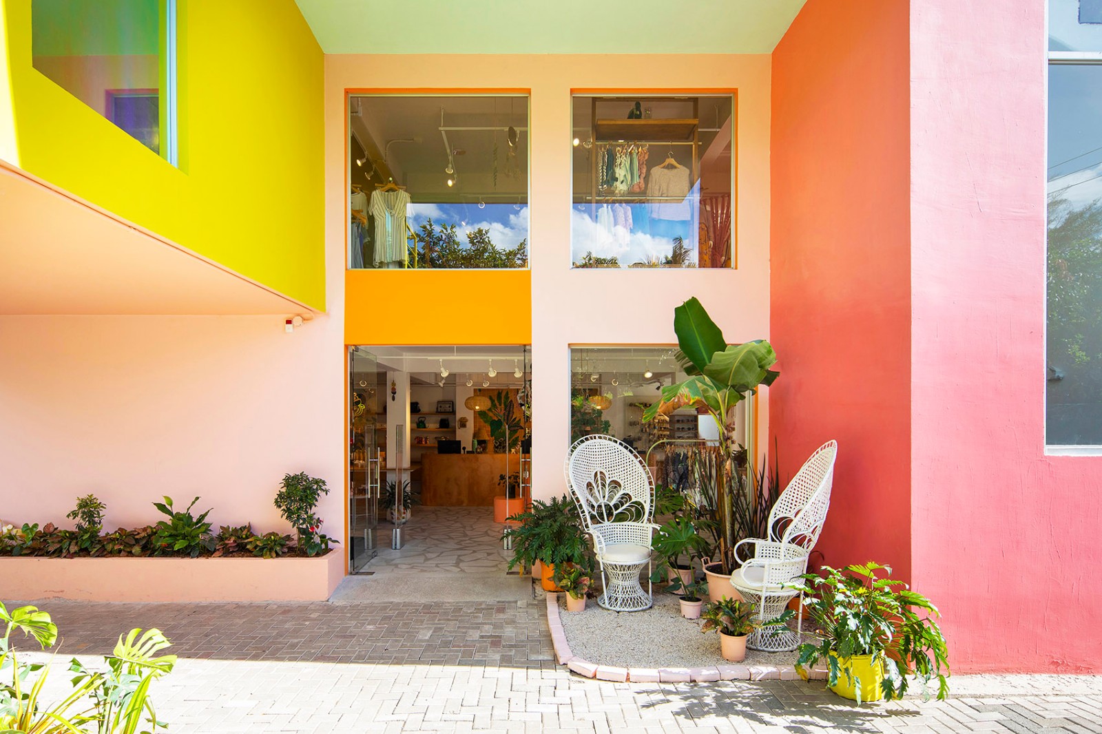 现有的建筑物已经涵盖了几个先前扩建的部分。设计团队为之增加了诸如室外电梯和楼梯等全新的元素,并用颜色组织起新旧体块,使建筑看上去彷佛如同一堆紧凑而俏皮的盒子,五光十色,鲜妍亮丽。设计团队清理了一部分外墙,剔除线脚和其他隔断,以获得简洁明晰的外观,此外还利用彩色反光玻璃窗对储藏区进行遮蔽。鲜艳的色彩灵感部分来自于拉丁建筑师路易斯·巴拉干(Luis Barragán)和里卡多·波菲尔(Ricardo Bofill)的创作,它们为环境营造出一种清新的哥斯达黎加式氛围,呼应了品牌千禧一代的客户以及商品本身。