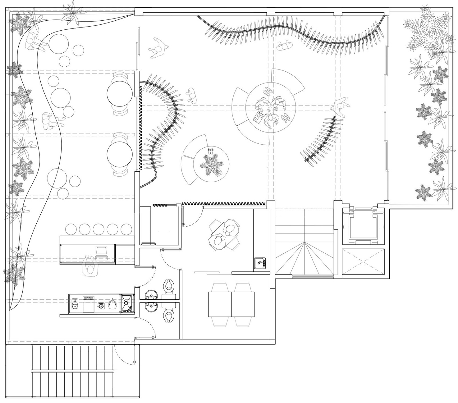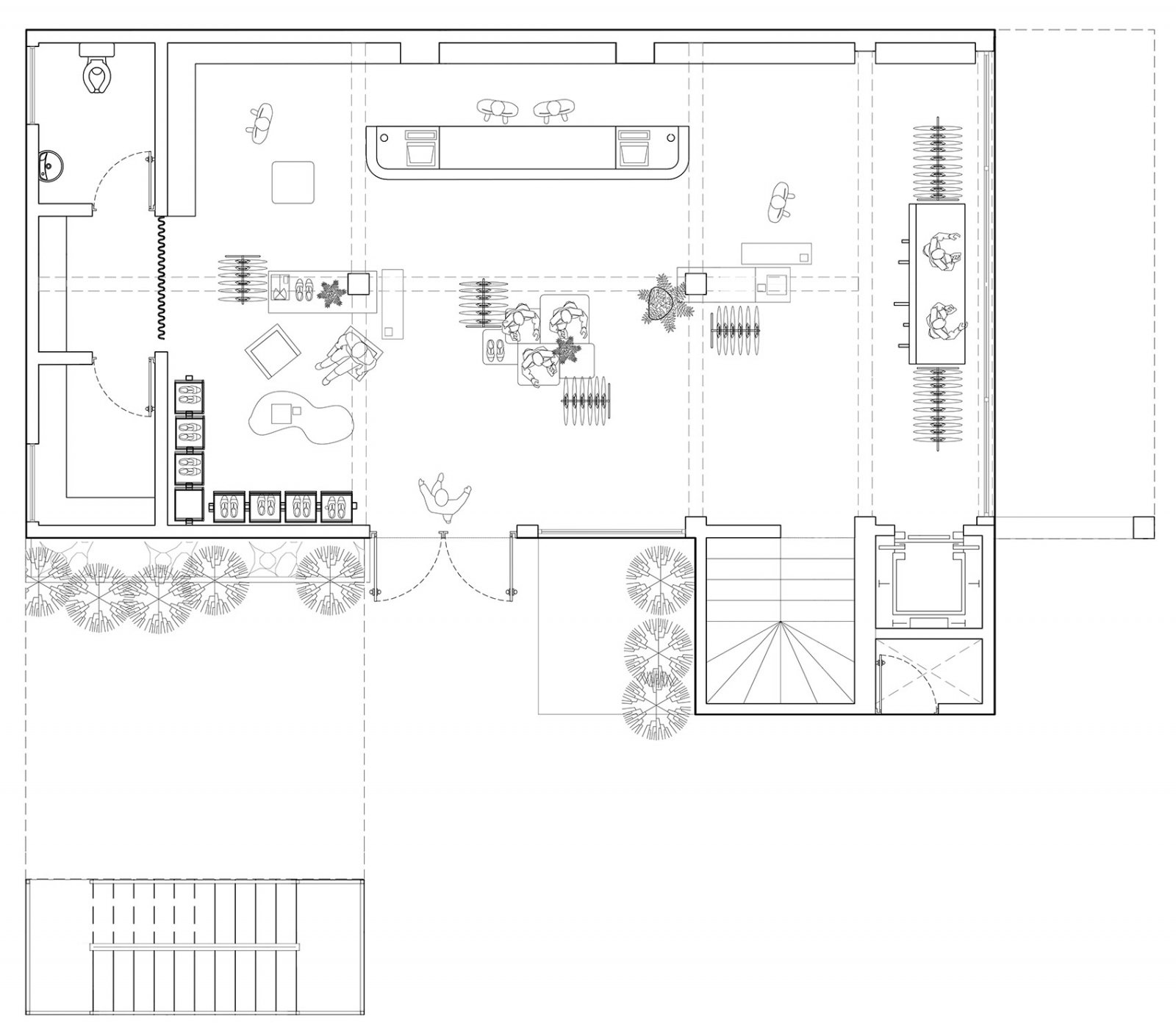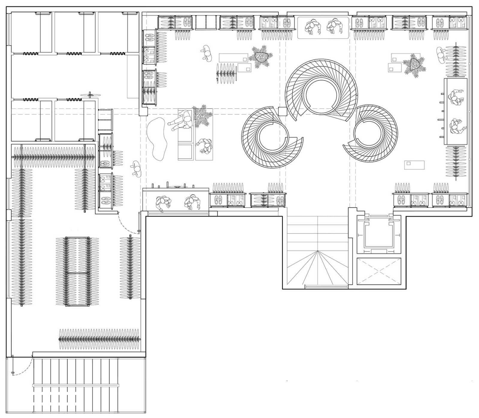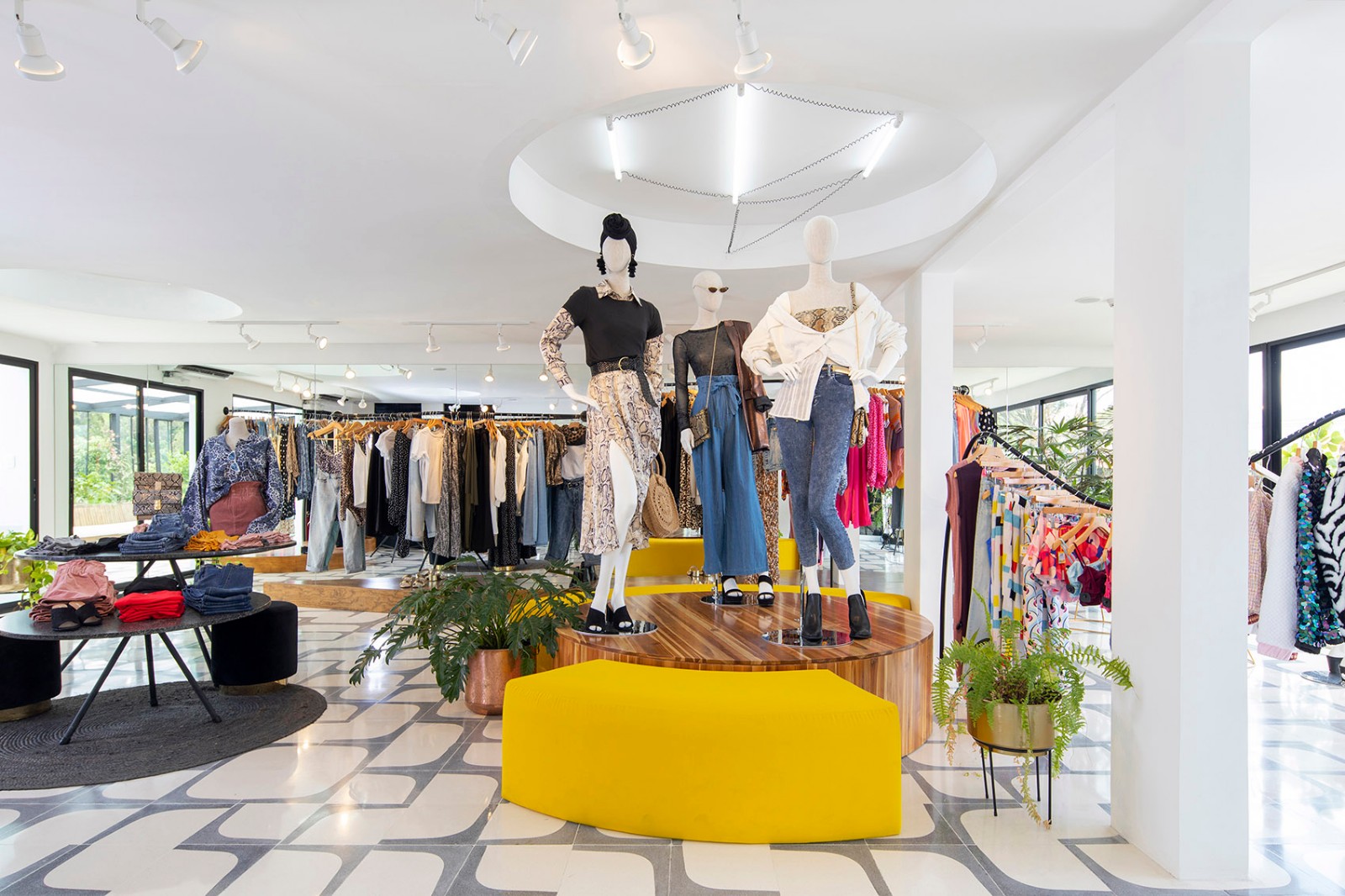 三层以设计师为导向,空间个性活泼鲜明,可为客户提供特别关照及造型服务。空间的元素更加曲线化和女性化,但色调也更为大胆。”Guzmán说。醒目的黑白色水磨石地板、钢制衣架、黄色和黑色的家具消解了三层商品的正式属性。而定制的深蜜色木工制品在全部楼层都有配备。