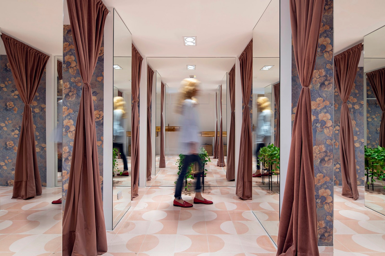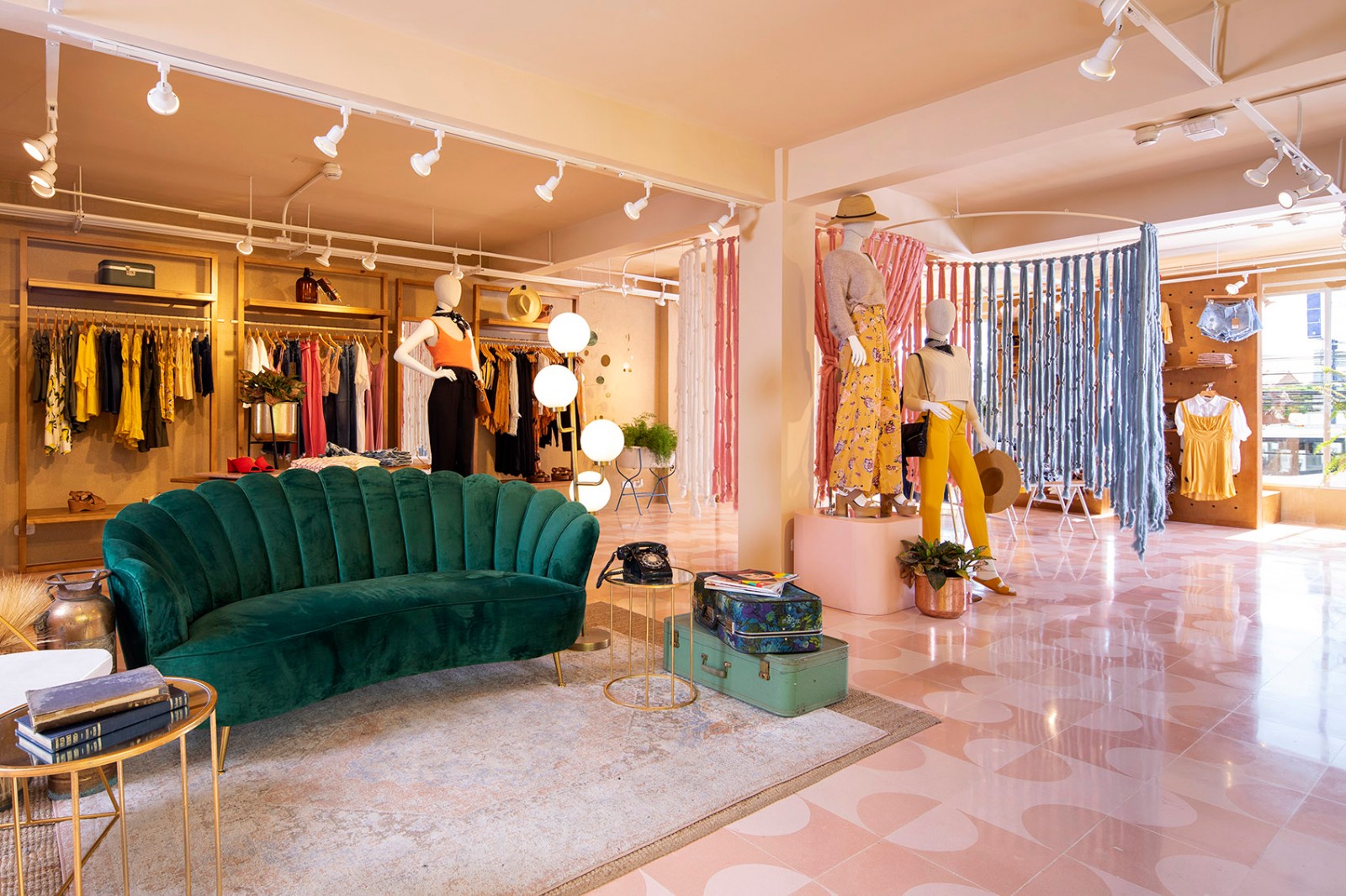 二层专门用于休闲服饰和基础款服装展售,空间由中性色调和手工材料打造,包括柔和的双色几何粉红地板、沙色灰泥墙壁和质地轻软的装饰,如纱帘和深绿色天鹅绒沙发。 彩色纱帘等元素调节空间,帮助空气流通,同时为客人创造出适合自拍或尝试造型的“体验间”。