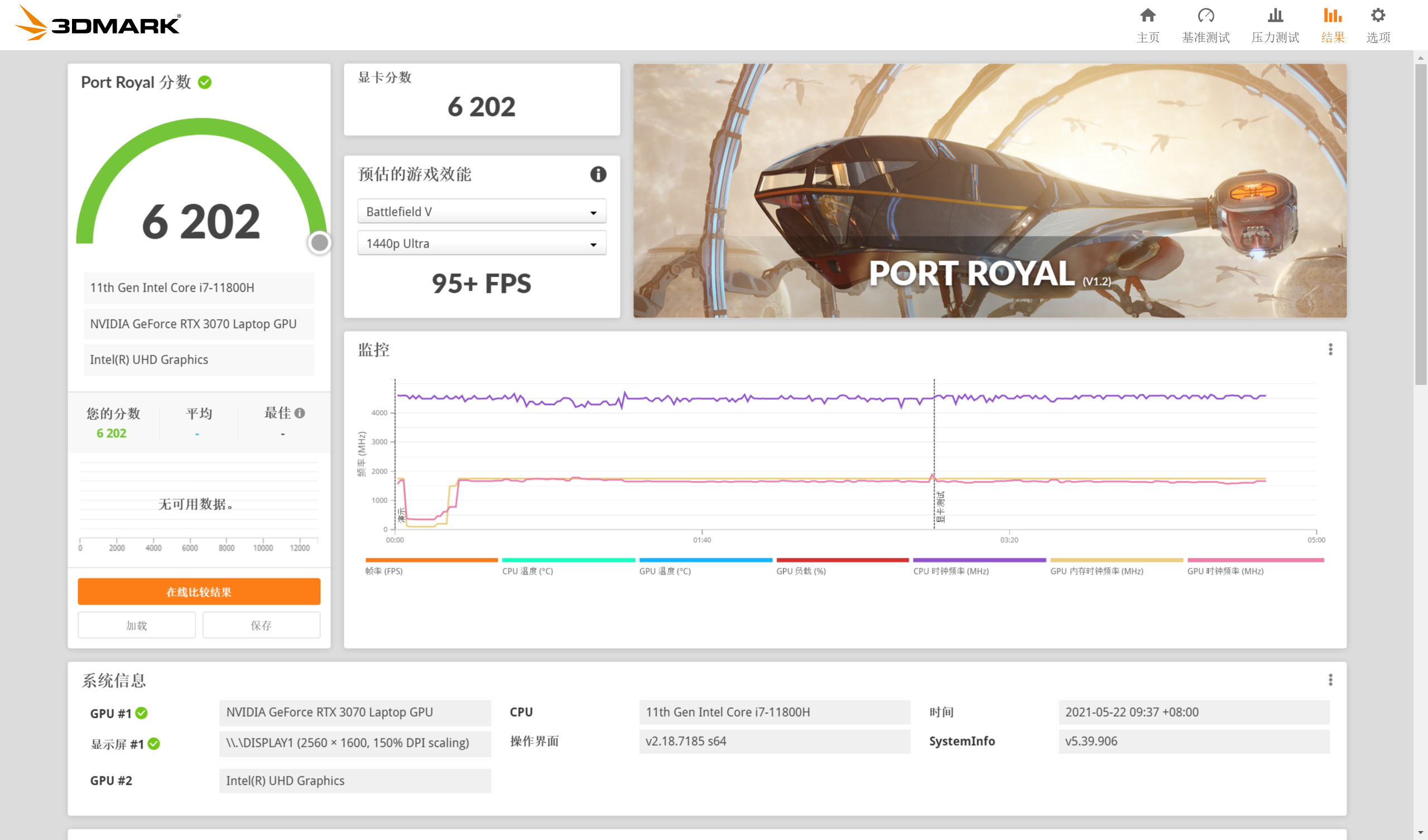 针对光线追踪测试的Port Royal测试中狂暴模式+一键强冷下得分6202。
