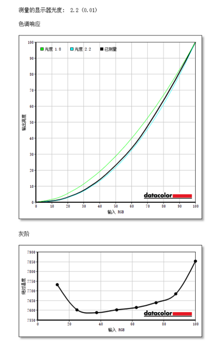 在色调响应方面,光度为2.2。灰阶方面,100%s输入RGB时,色温在7850K左右,在亮度在20%~80%左右时色温也基本稳定在7600K上下。整体色温偏冷。