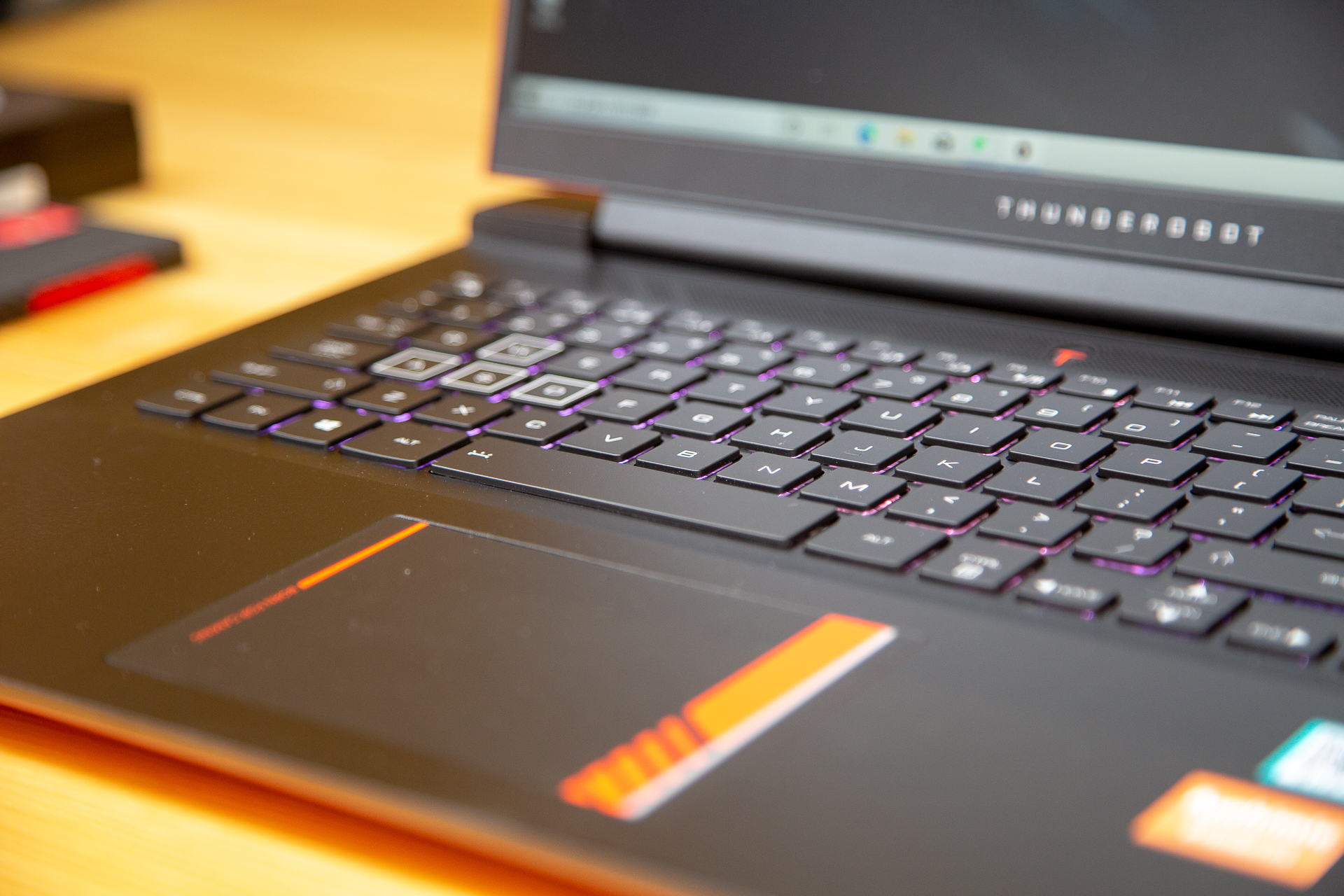 C面采用全键盘设计,而且可以看到触控板上也有橙色的条纹装饰与整体配色相呼应。三区式RGB背光键盘可以分区设置灯光效果。右上角的一键强冷快捷键也尤为显眼,开启之后确实可以快速提升笔电散热,但同时带来的噪音量也不容小视。另外虽然是全键盘设计,但是数字键区域较小,导致会有一些按错的风险。