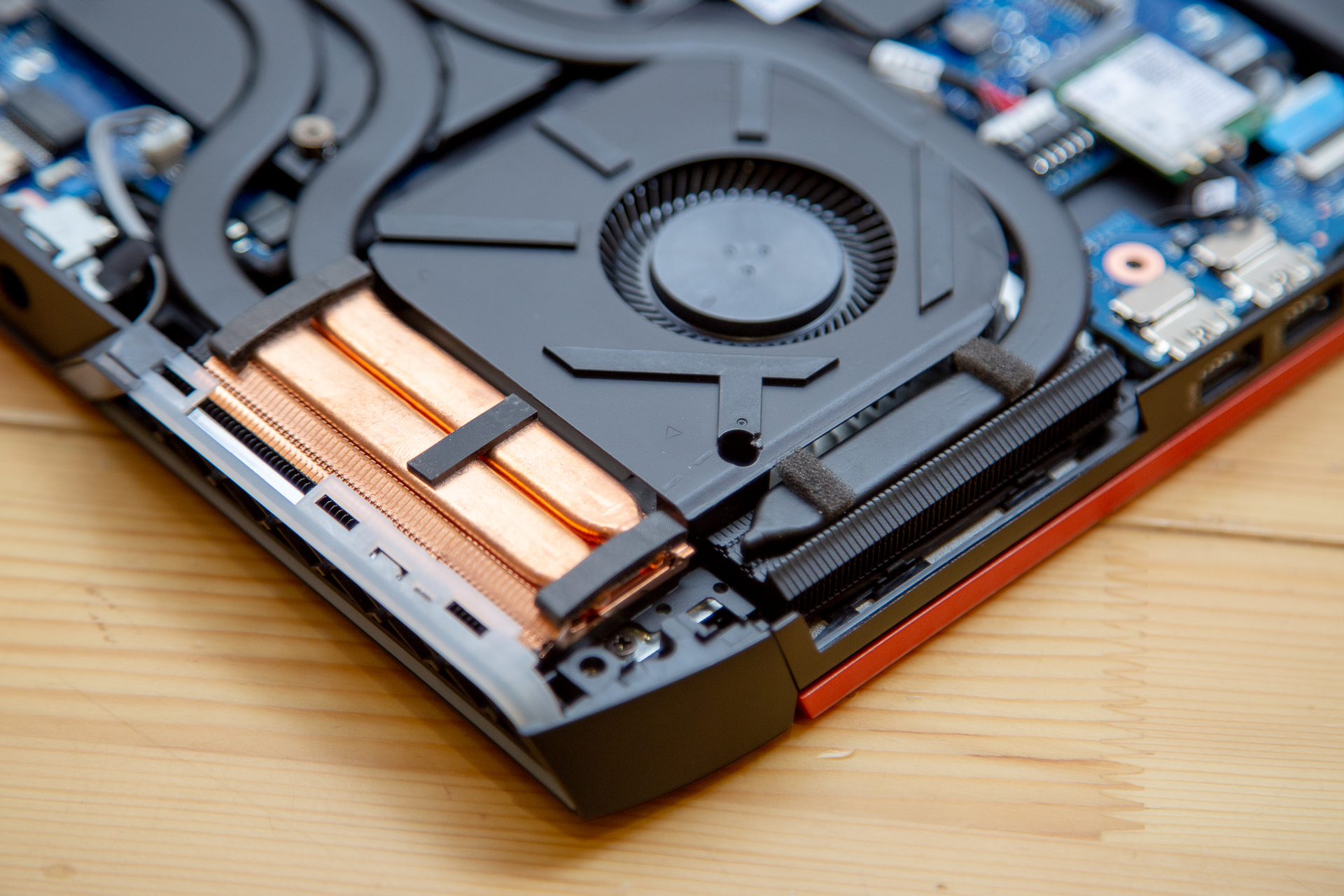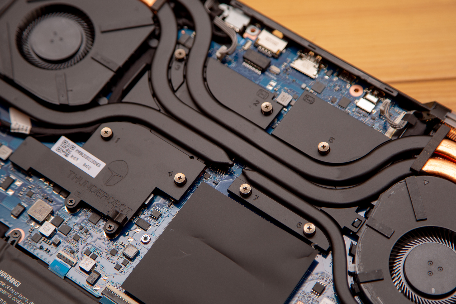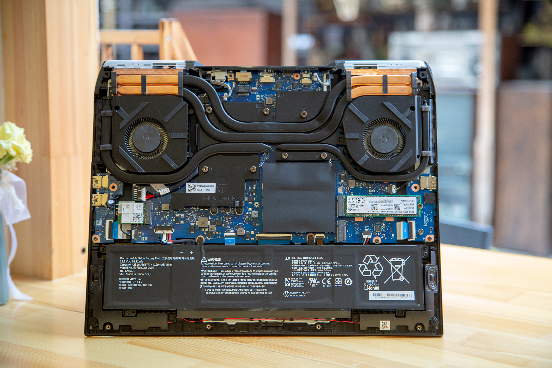 拆机方面并没有什么难度,注意螺丝全部拆卸即可。打开后可以看到内部结构还是非常规整的,双风扇+五铜管设计。这也是雷神为玩家带来的风洞 Pro 散热架构 2.0,两根较粗的铜管贯穿CPU和GPU之间,以应对不同游戏压力,以便发挥Dynamic Boost 2.0性能释放。
