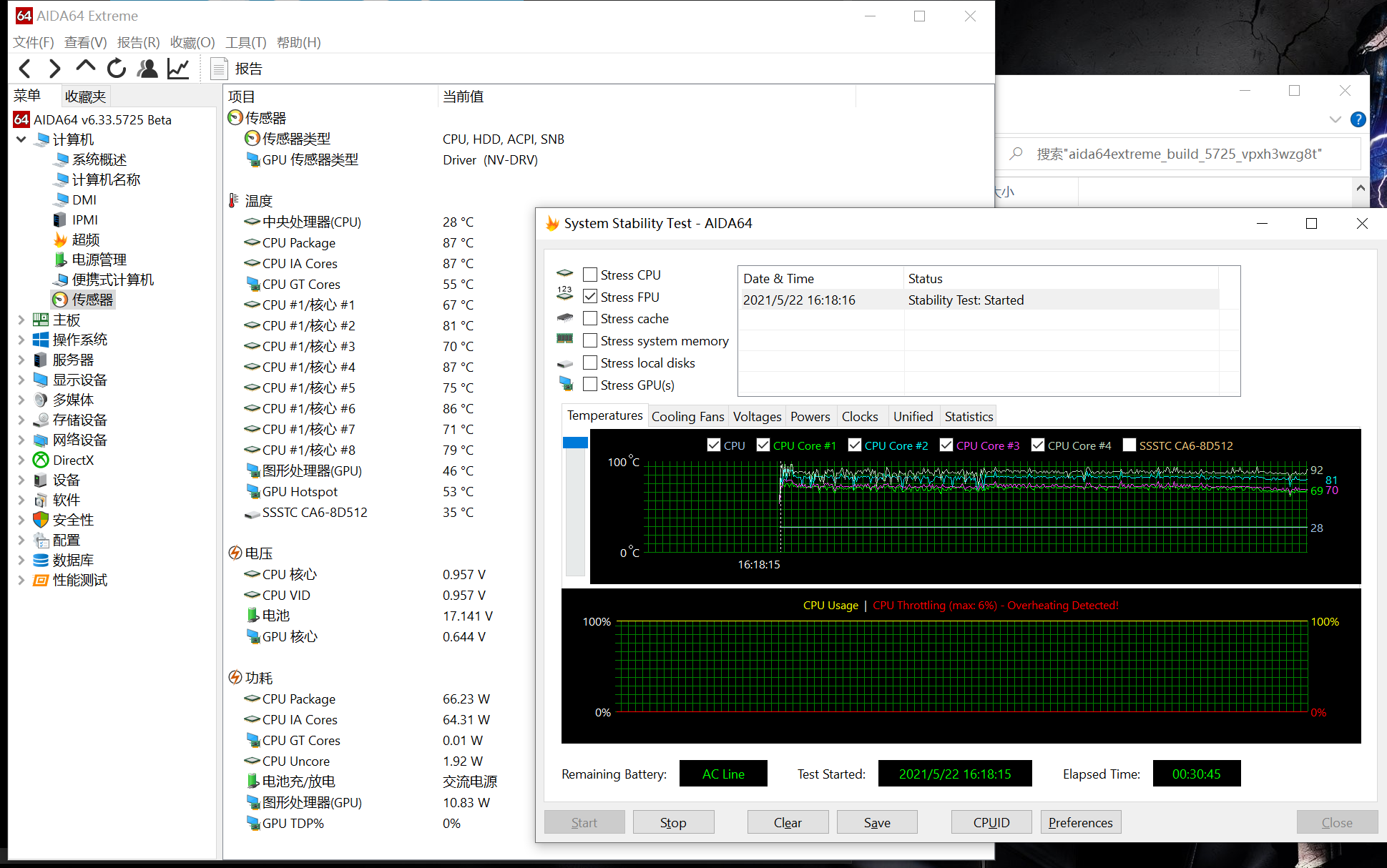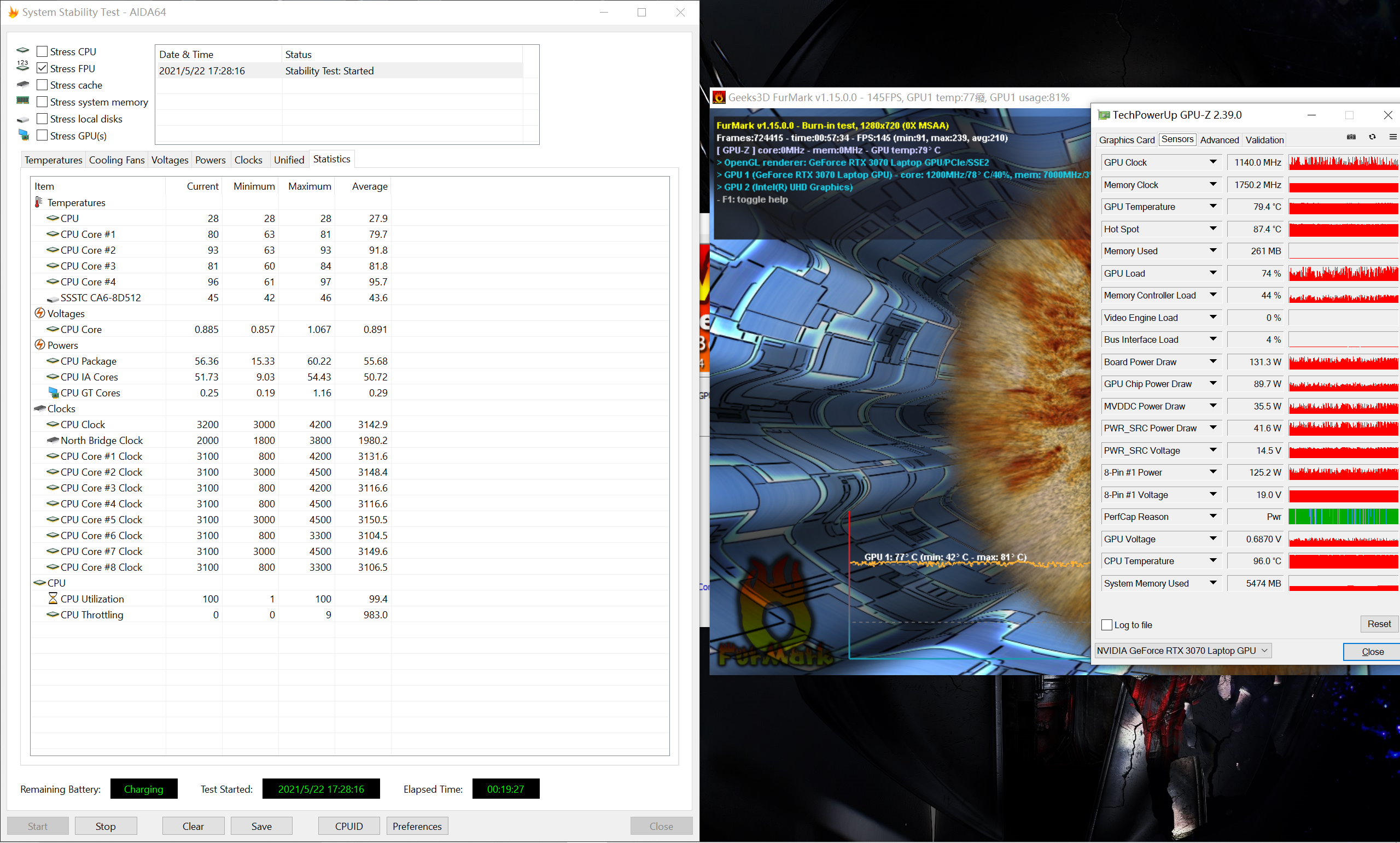 双烤30分钟后可以看到CPU频率稳定在3.1GHz功率在56W左右。显卡功率在130W,温度保持在80℃上下。