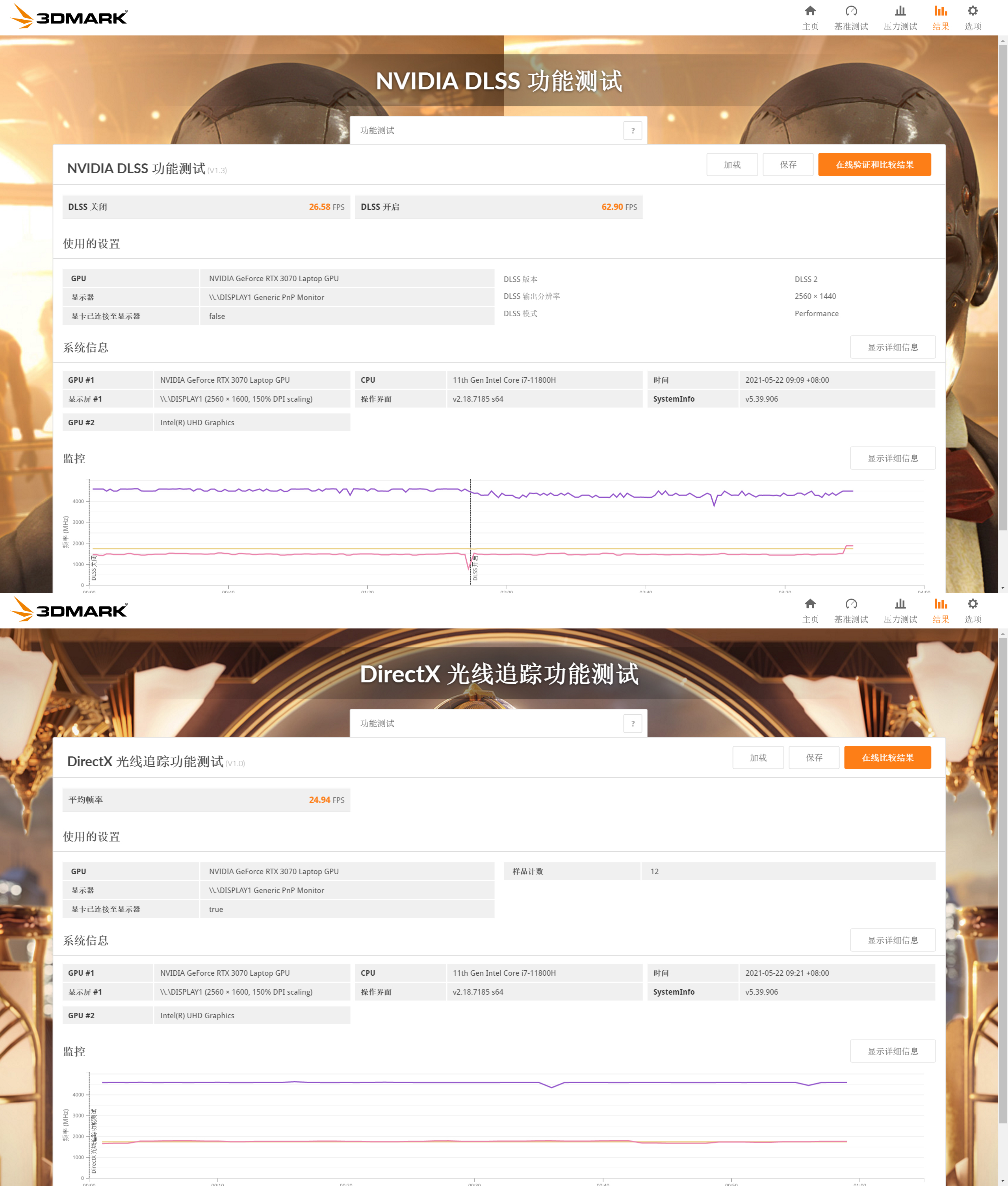 另外分别对NVDIA DLSS 2.0在2K分辨率下进行了测试,可以看到在DLSS 2.0关闭运行帧数为26.58FPS,在DLSS 2.0开启后为62.90 FPS,可见开启后提升还是十分明显的。DirectX光线追踪功能测试中也可看到平均帧率也达到了26.94FPS。