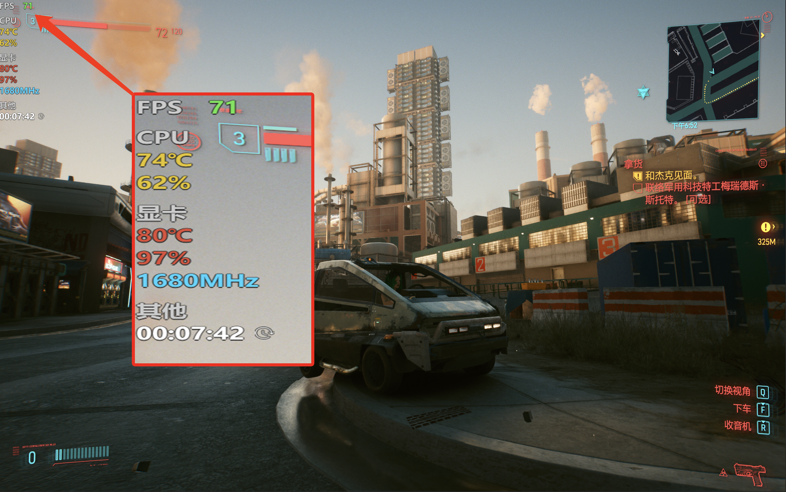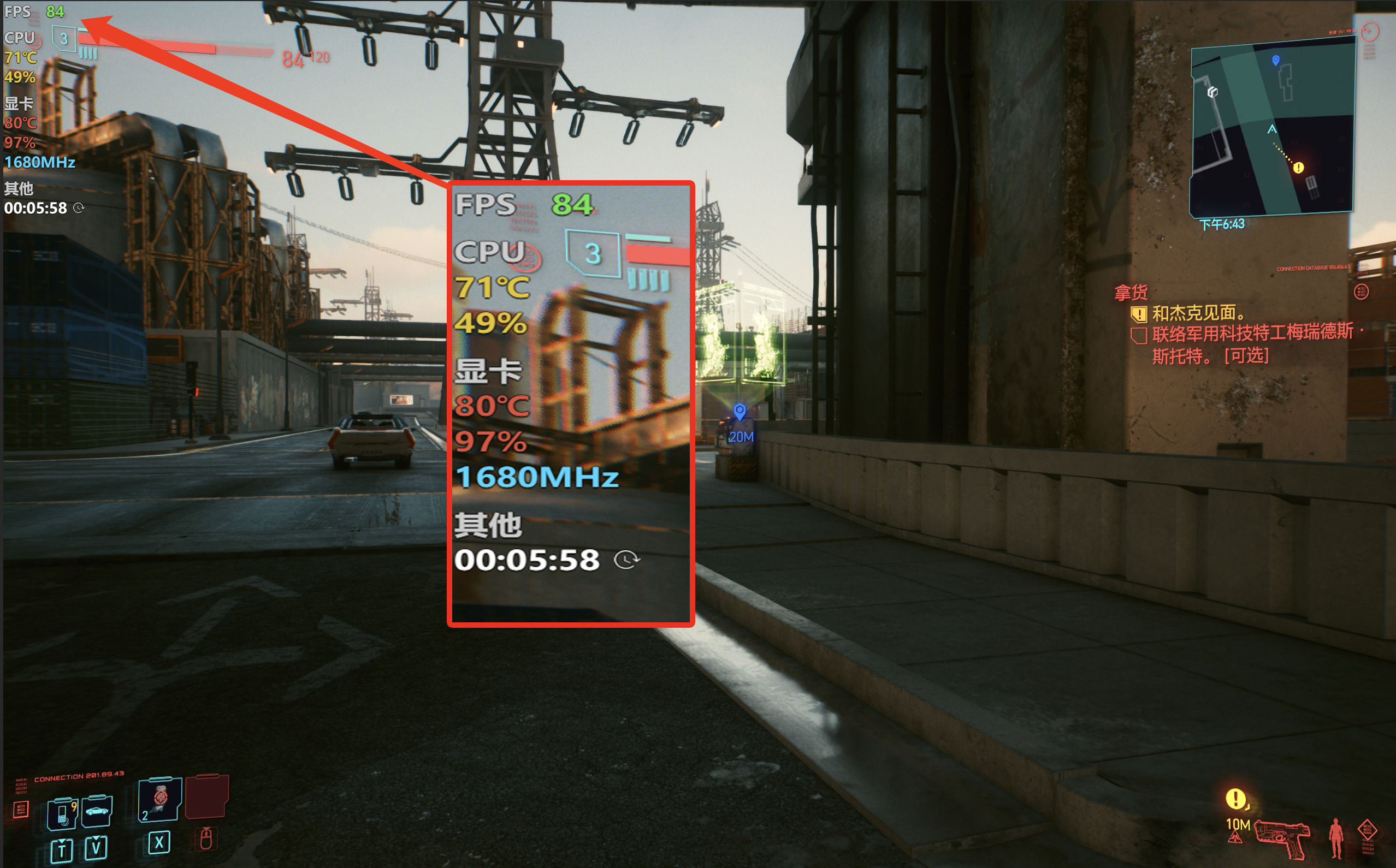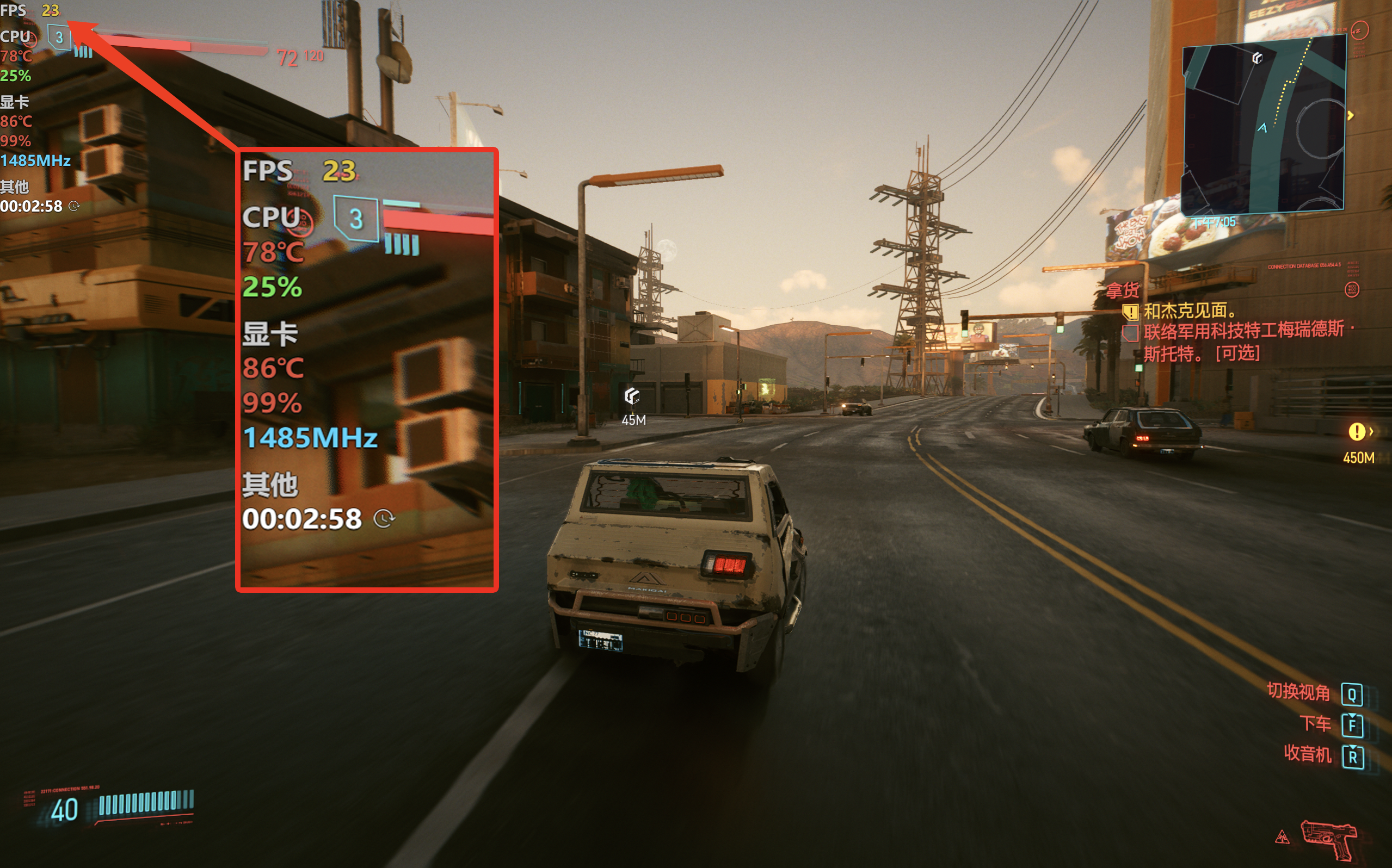 单独开启光追之后发现《赛博朋克2077》目前确实还是爸爸,开启超级光追后在回到游戏平均帧数直接降到了23FPS。