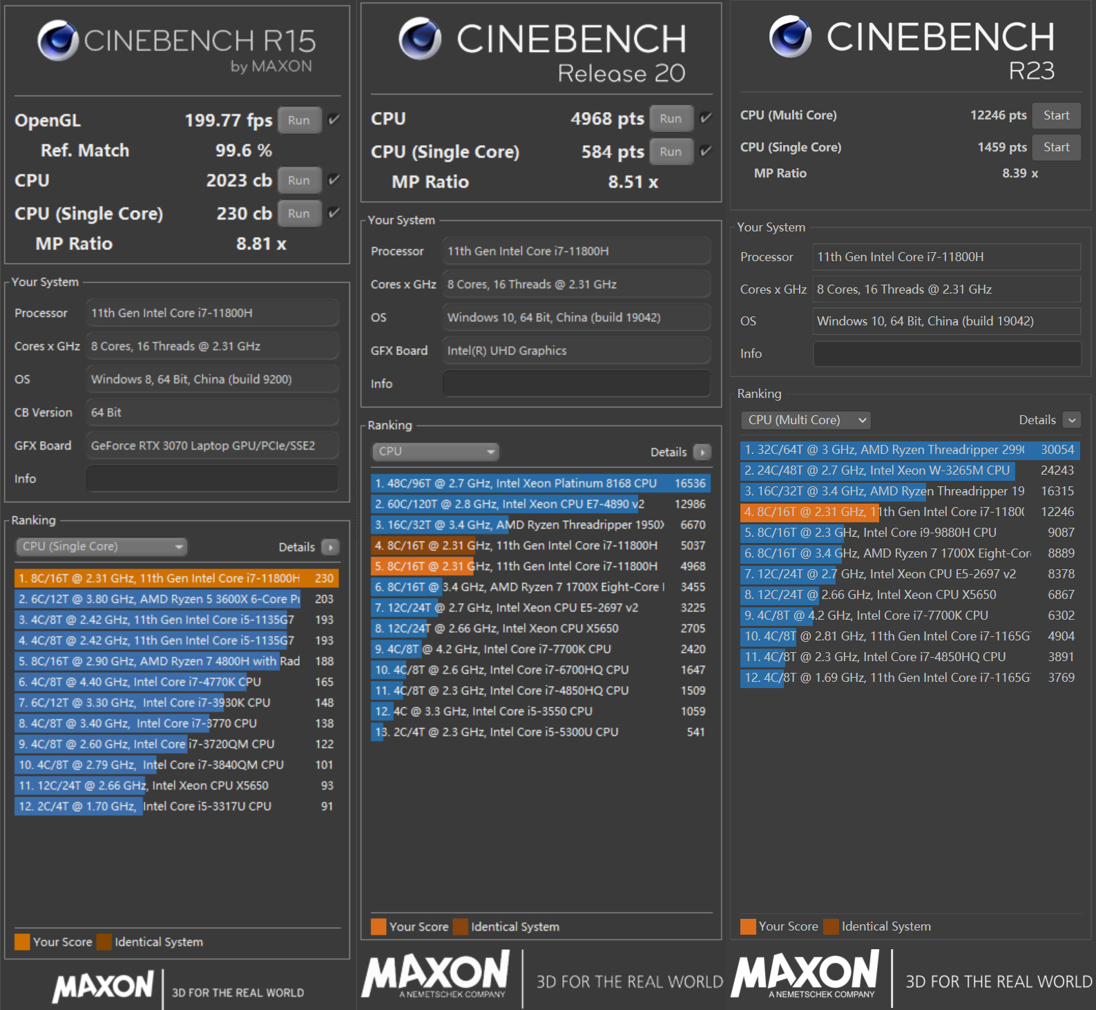 通过Cinebench R15以及R20测试可以看到:R15测试i7-11800H多核分数为2023cb、单核230cb,其RTX3070成绩:199.77fps;R20测试CPU多核分为4968pxs,单核 584pts;R23测试CPU多核分为12246pts,单核 1459 pts。测试在风扇开启一键强冷和狂暴模式下测试。