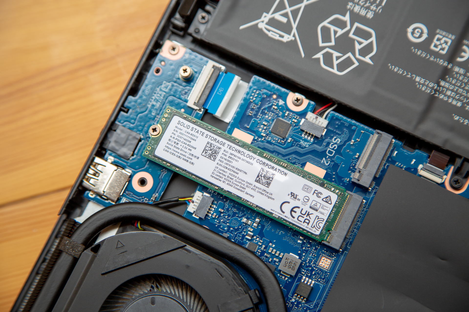 预装SSD是一根PCIe4.0的NVMe SSD,在一侧可以看到还预留了一个PCIe 4.0的M.2接口。两个PCIe 4.0接口都是CPU直连设计的,对于容量不够的用户来讲,自行升级一个支持PCIe 4.0的大容量固态会是一个不错的选择。