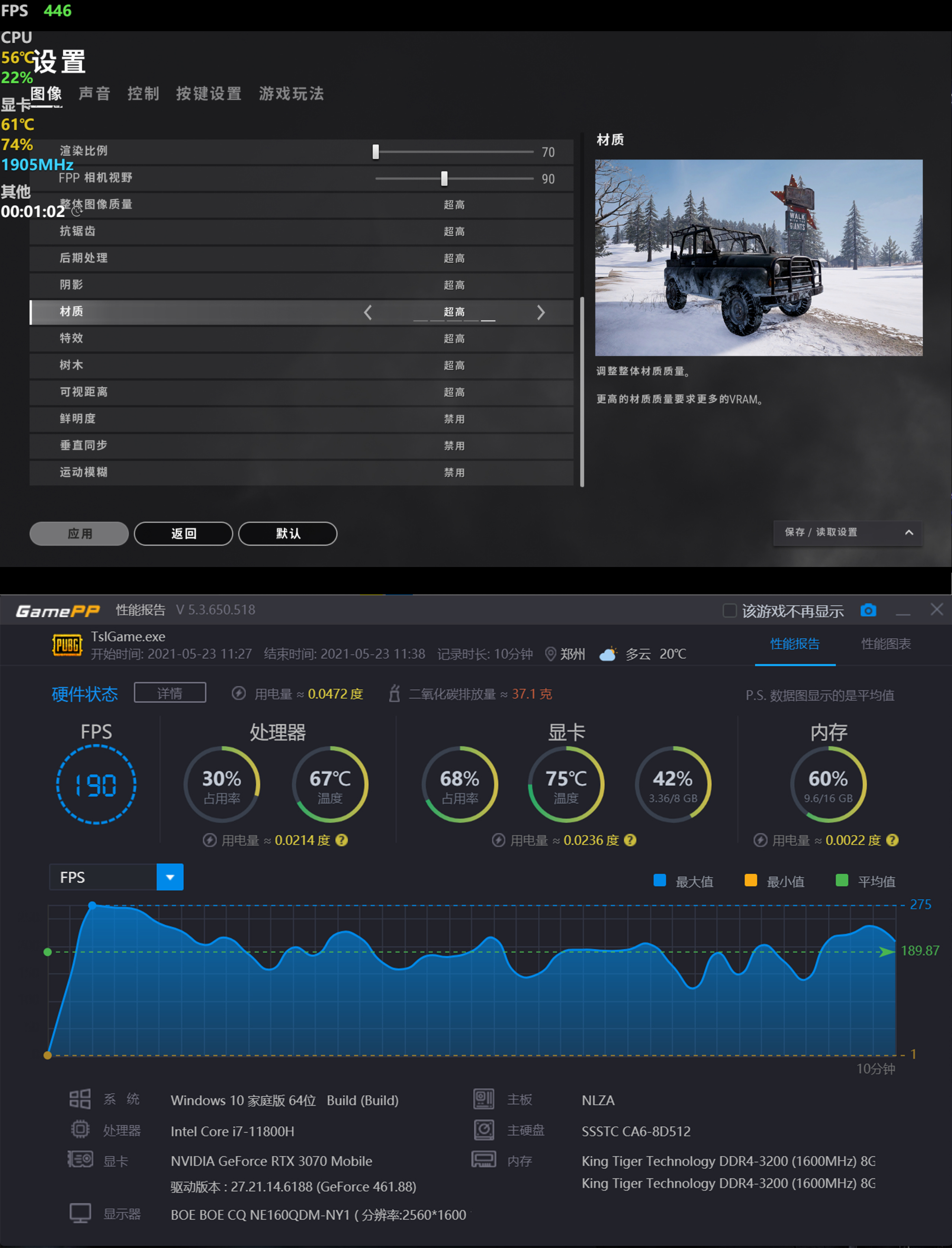游戏表现先从热门游戏来讲,《PUBG》这款吃鸡游戏也是火了有好几年了吧。从最初的硬件杀手,到现在可以说直接被RTX3070性能秒杀,实测在2K(2560*1600)分辨率下特效拉满的情况下,通过软件可以看到平均帧率190FPS,可谓流畅吃鸡了吧。这样的游戏性能也真的是可以很好的喂饱这款2K 165Hz刷新率的屏幕。