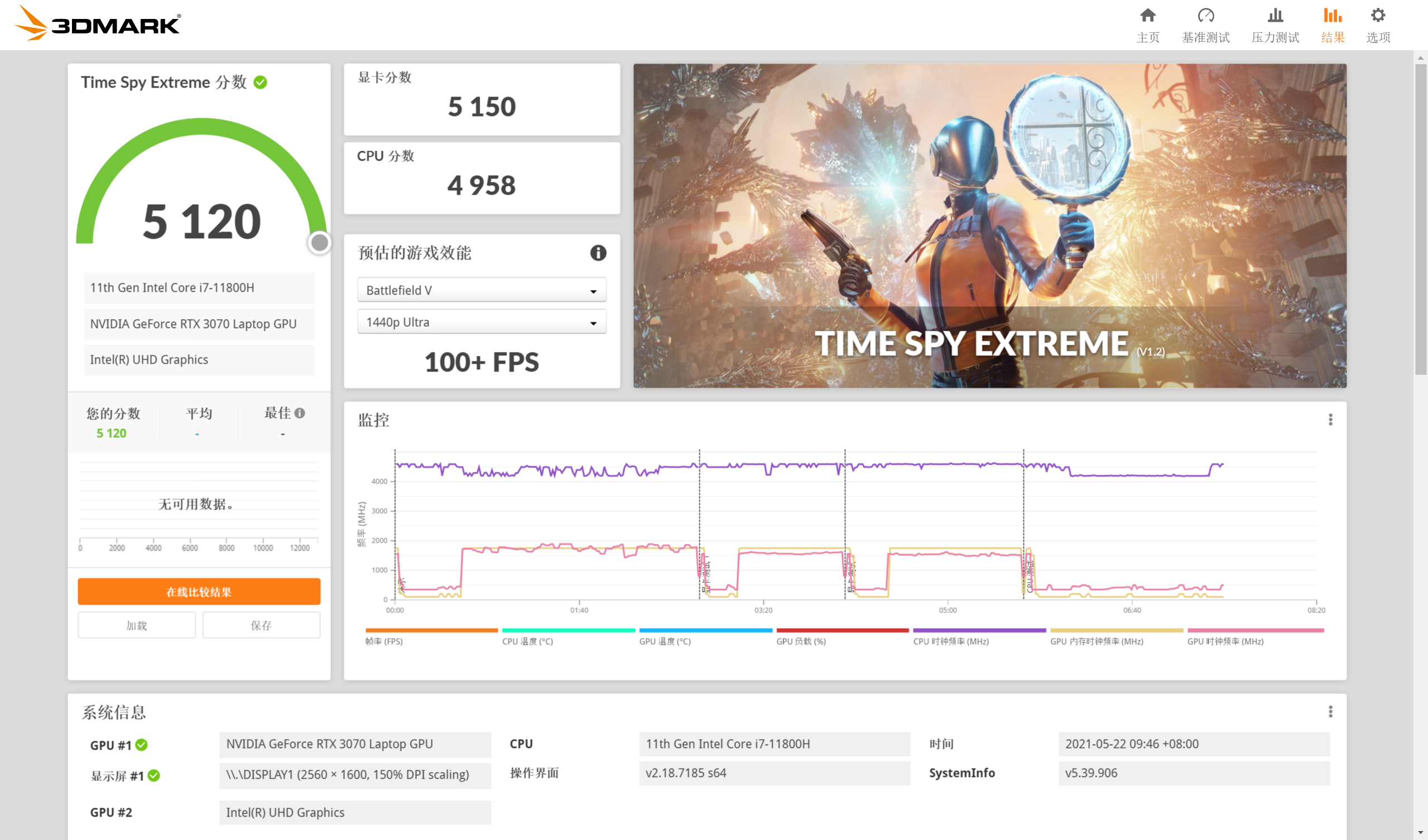 3D MARK测试成绩如图,Time Spy Extreme测试狂暴模式+一键强冷下得分来到5120,显卡分数5150,CPU分数4958。
