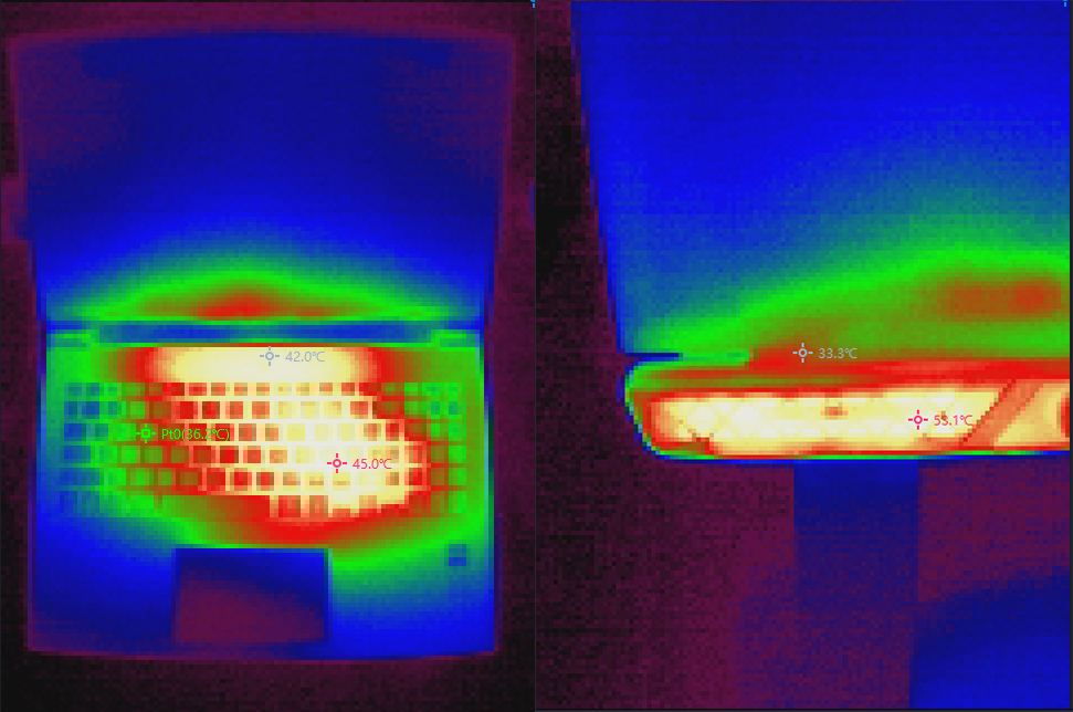 通过红外测温枪可以看出整体散热方面雷神ZERO也很好的避开了玩家游戏时高频操控的的WASD键位,通过机身背后出风口位置也可以看出,整体在一键强冷模式下从机身背后出风口位置带出了大量热能。测试时环境温度30摄氏度上下。