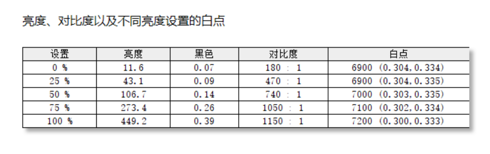 亮度方面,最大亮度449.2cd/㎡,最低亮度11.6d/㎡,对比度在100%亮度下为1150:1,白点为7200K。