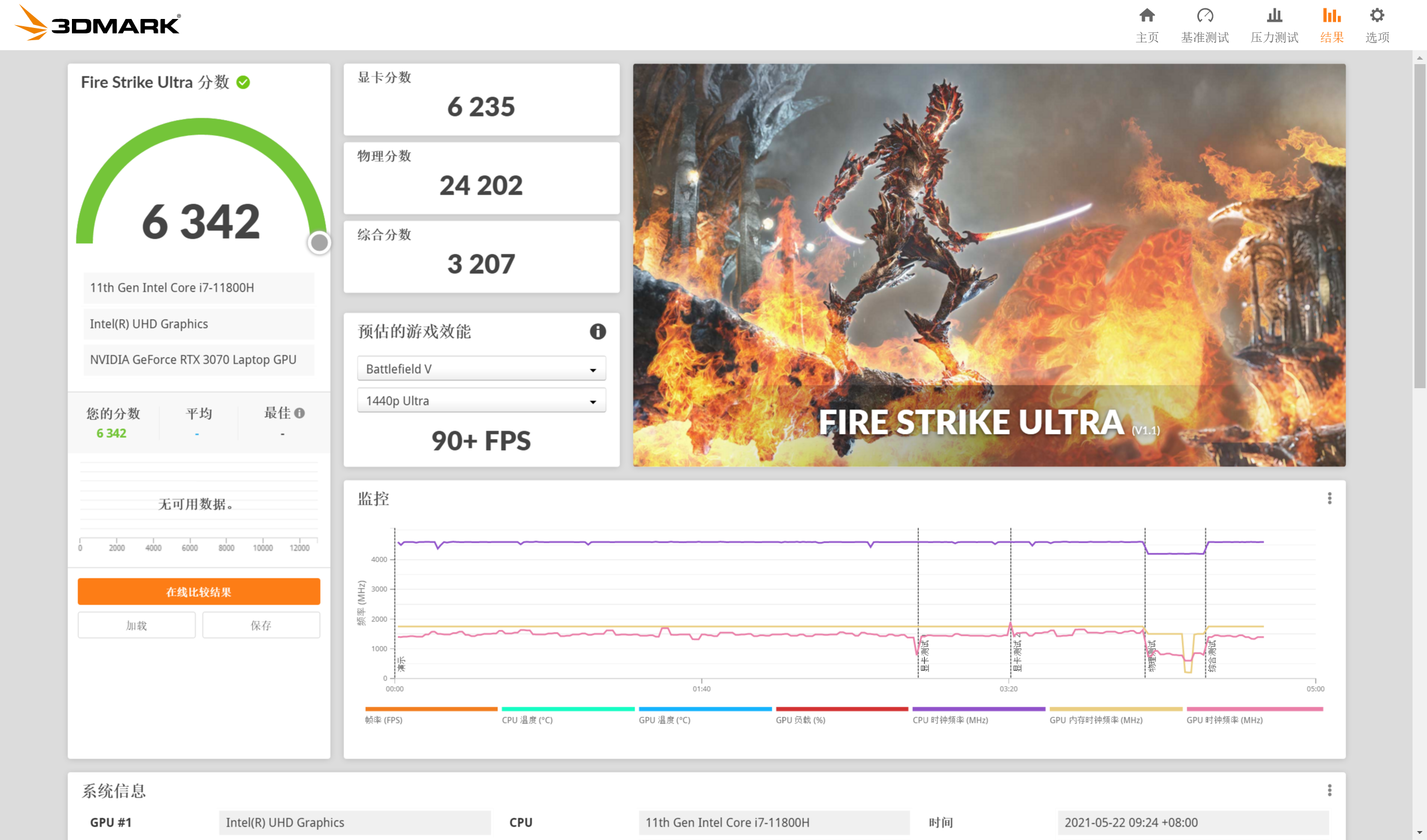 Fire Strike Ultra 在开启狂暴模式+一键强冷后得分6342,显卡分数6235,24202,综合分数3207。