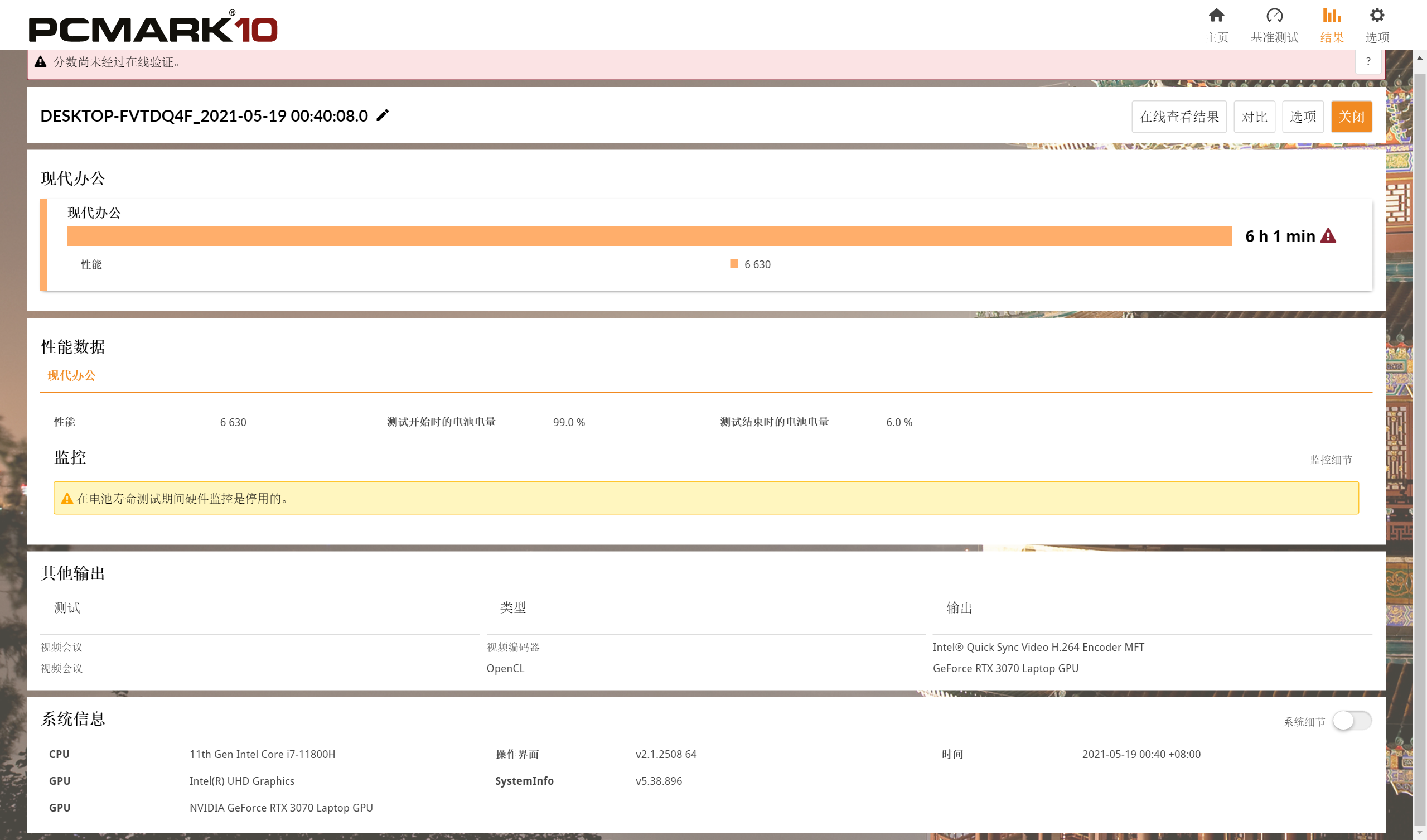 实际通过PCMARK 10的现代办公的方式进行续航测试,测试时笔记本开启续航模式。实测表现6小时1分钟。这样的成绩可以从一个侧面反映出笔记本的实际续航表现如何了,不知道各位入手的游戏本表现如何。