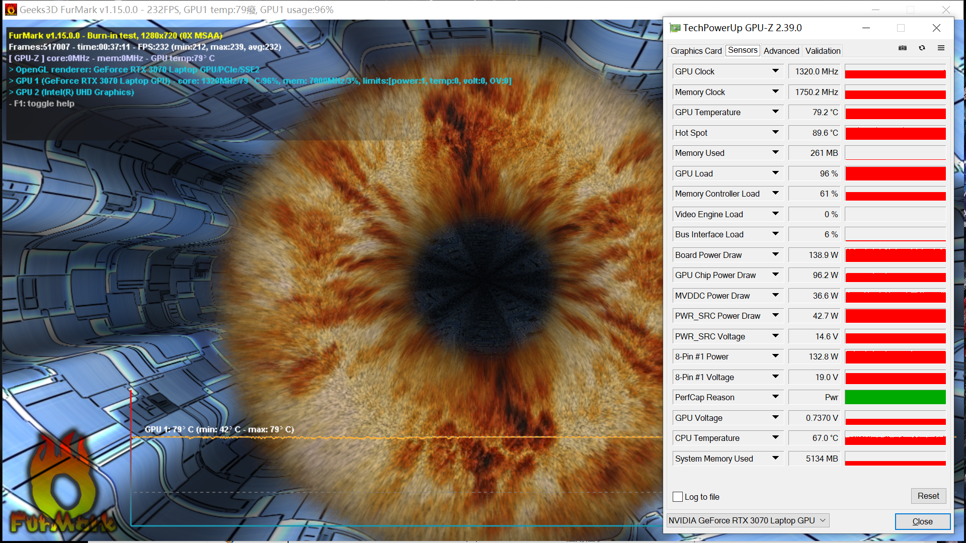 显卡甜甜圈单烤可以看到显卡满载功率在138.9W,显卡温度来到了80.6℃。