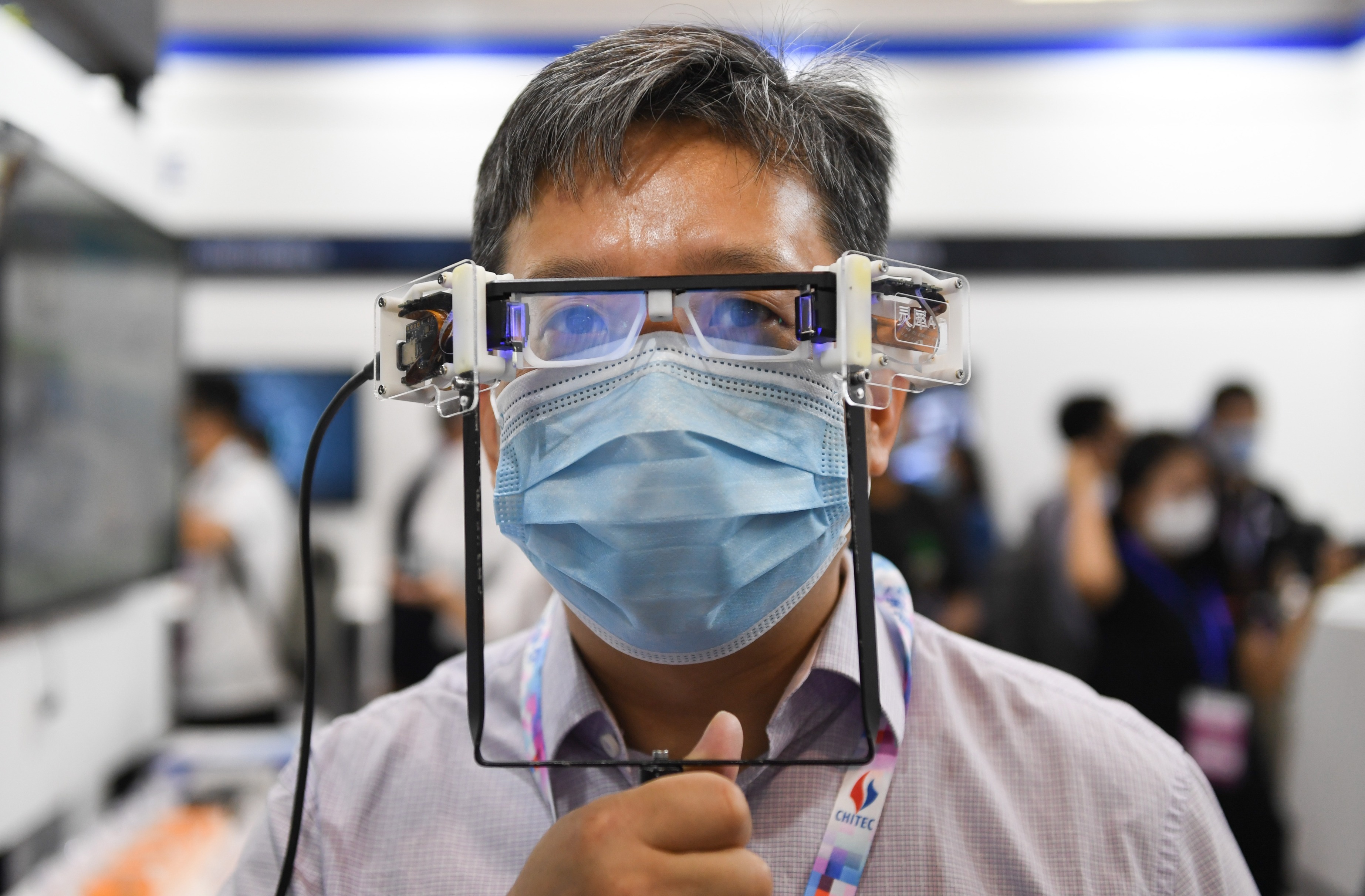 2020年9月17日,一名参观者体验一款AR(增强现实)眼镜光学显示模组。当日,第二十三届中国北京国际科技产业博览会在北京开幕。新华社记者鞠焕宗摄