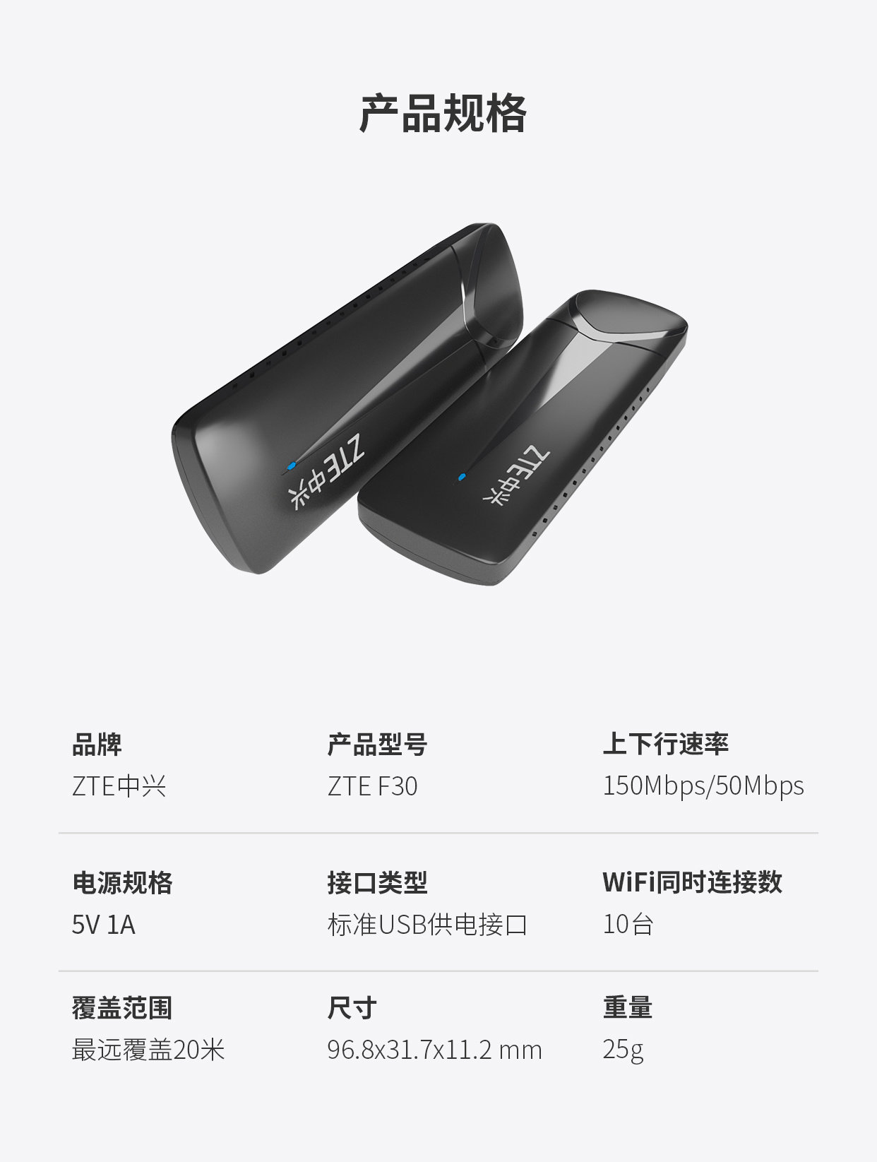 IT之家了解到,中兴 F30 搭载中兴微 V3T 系列自研芯片,整机大小跟 U 盘大小差不多,重量仅为 25g,内置电信、移动双卡,插电即用,支持 10 台设备同时连接,上下行速率为 50Mbps / 150Mbps,下载一部高清电影仅需 3 分钟。