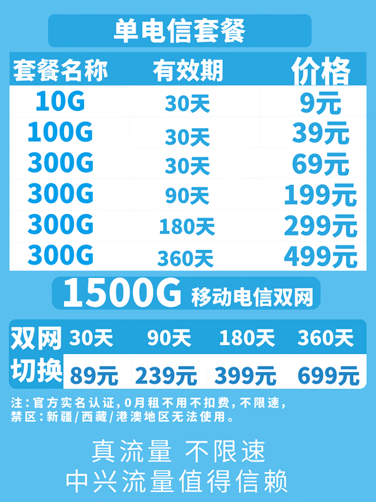 资费方面,它提供了电信 300G 套餐和移动电信双网 1500G 套餐可选,包月价分别为 69 元、89 元,可通过微信公众号进行充值和管理。用户最高可开通 24 个月套餐,两款套餐分别为 899 元和 999 元,号称 1G 低至 3 分钱。