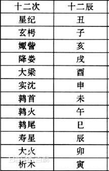 十二次:星纪、玄枵、娵訾、降娄、大梁、实沈、鹑首、鹑火、鹑尾、寿星、大火、析木。