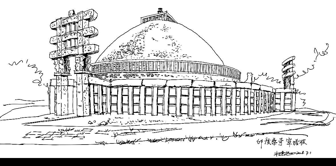 从印度到中国。佛教创立之后,在印度产生了寺院等修行场所,教团传法活 动逐渐从流动场所到固定地点,并建立了僧侣居住、修行、传法的僧院。最早的僧院称为精舍,强调生活修行条件,尚未重视对佛陀的礼供崇拜。精舍的形制和功能较为简单,与当时当地的居住建筑具有同源性。精舍中比较有名的有舍卫城的祇园精舍等,在佛教典籍中多次提及佛祖在此的传法活动。佛陀圆寂后,门徒火化佛陀遗体得到舍利子并建塔供奉,“佛既谢世,香木焚尸,灵骨分碎,大小如粒,击之不坏,焚亦不焦,或有光明神验。胡言谓之舍利。弟子收奉,置之宝瓶,竭香花致敬,建宫宇谓之塔。塔亦胡言,犹宗庙也,故世称塔庙”。早期印度佛塔按梵语音译称为窣堵波,其形制和建造工艺与古印度的陵墓葬仪有渊源关系。窣堵波用土石堆筑成半球形,外部围护砌砖,顶部树高幢杆,后随着佛教影响的扩大,逐渐演化成佛塔,幢杆也演化成塔刹。佛教寺院建造佛塔后,产生了既是佛教的视觉标识,又是佛教精神物化的表现 并受到尊崇的效果,如下图。受此影响,早期的佛教寺院逐渐形成以塔为中心的格局,其主要特征是佛塔为全寺中心,四周布置修行、生活建筑,这一特征也伴随着佛教向西亚、中亚的传播而得以流传开来。佛教传入中国后,一些掌握建筑技艺的来华僧人主导或参与了佛塔的修建工作,如刘宋时罽宾国高僧昙摩密多,“度流沙,进到敦煌,于闲旷之地,建立精舍。植柰千株,开园百亩,房阁池沼,极为严净……会稽太守平 昌孟顗……及临浙右请与同游。乃于鄮县之山建立塔寺”。当然,传播过程中窣堵波的外形和高度逐渐发生了变化,到中原时其形象与印度佛塔已大不相同。随着佛教的传播,除了佛塔,还有石窟这一佛教建筑形式也伴随传播开来,古犍陀罗王国(今 巴基斯坦、阿富汗一带)留下了大量的石窟、佛像石雕等,并对早期的中国佛教建筑 产生了重大影响,如敦煌莫高窟、云冈石窟等作为这一时期石窟的代表,含有犍陀罗风格,反映了佛教自印度途经中亚、西亚传入中国的历史轨迹。
