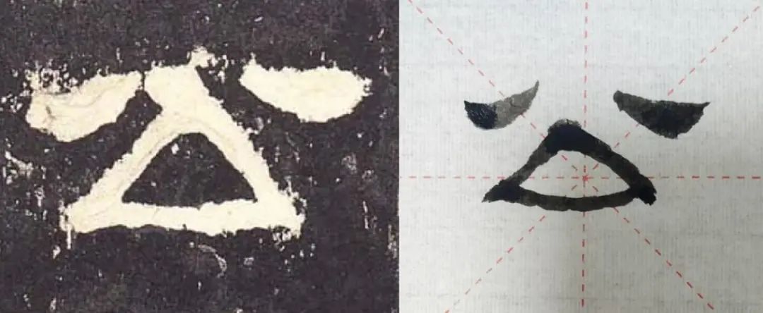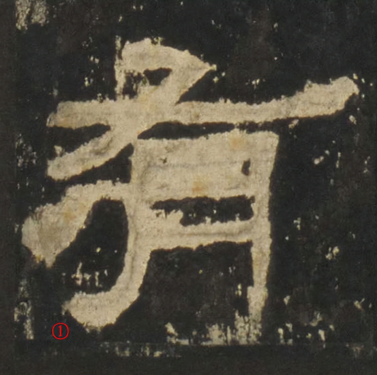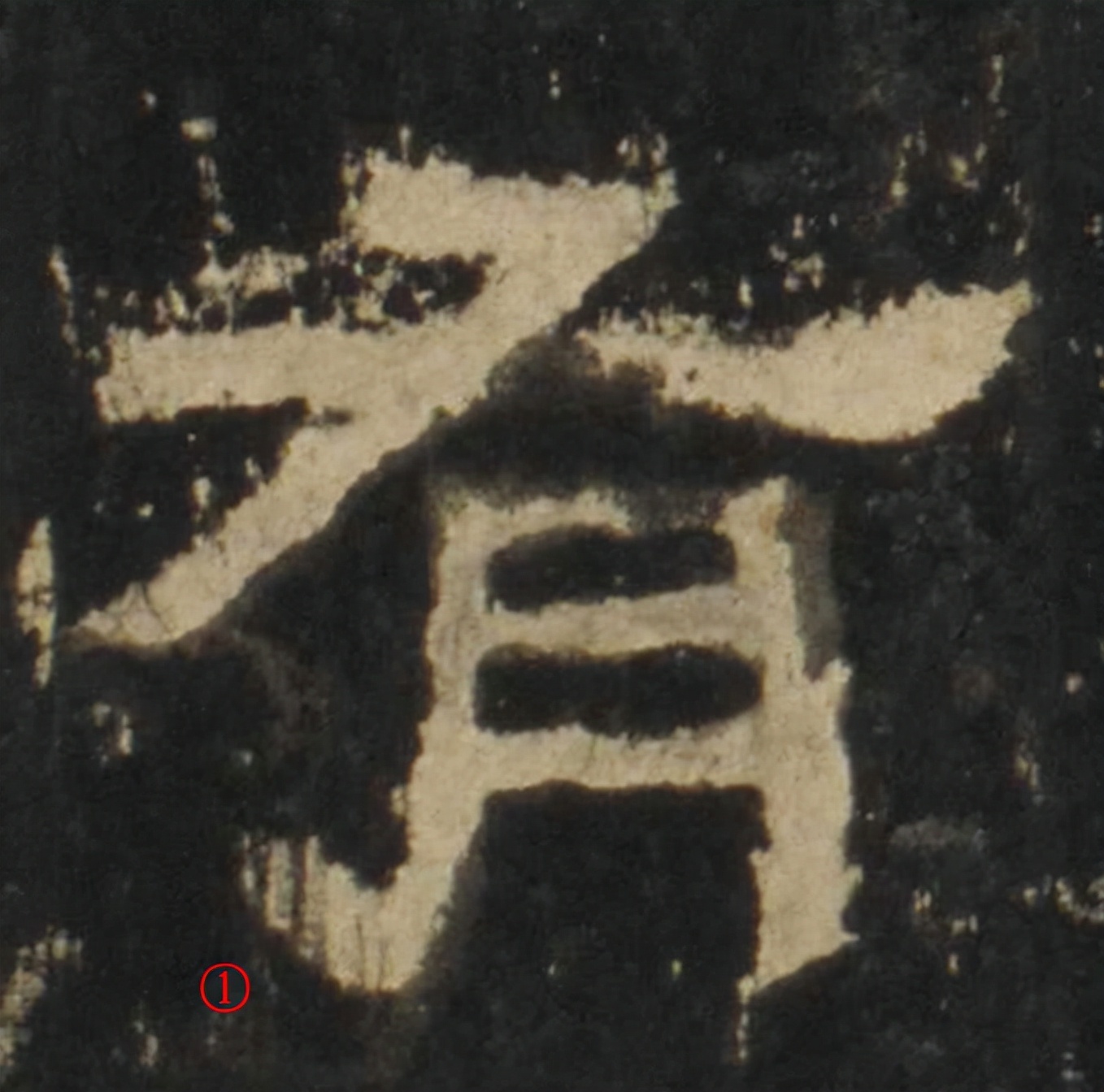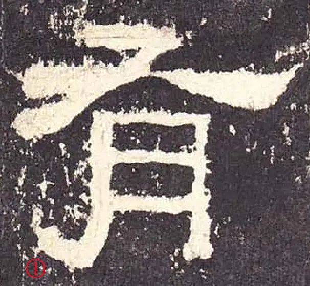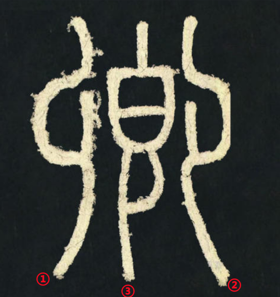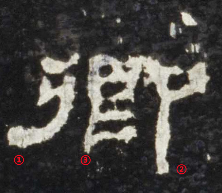 从拓片上看,笔画①出波的时候转折剧烈,但却没有收尖的磔尾(这似乎暗示了原作者书写这一笔的时候没有通常书写波磔的揭笔动作)。