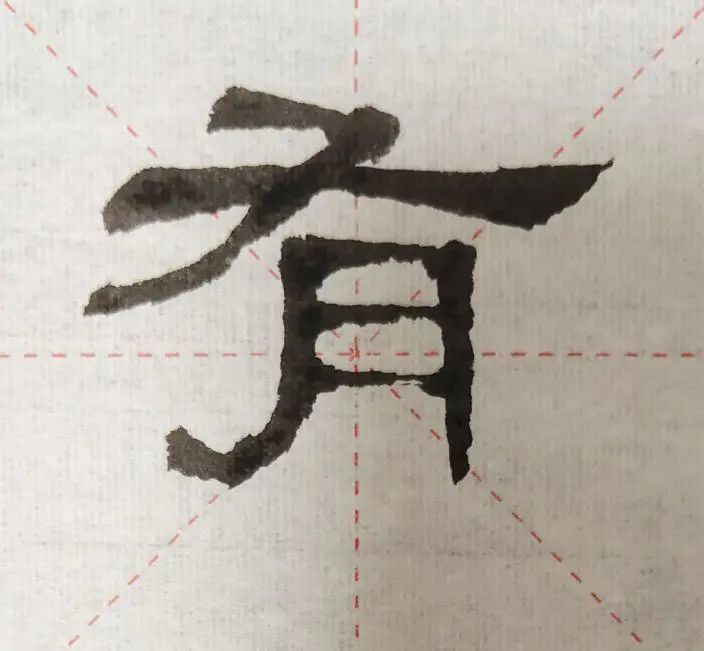 我们今天临写的这个“有”字,它的笔画①究竟采用了哪种笔法,拓片上的反映有些模糊。如果照第一种笔法来写,成字的形态该是这样:
